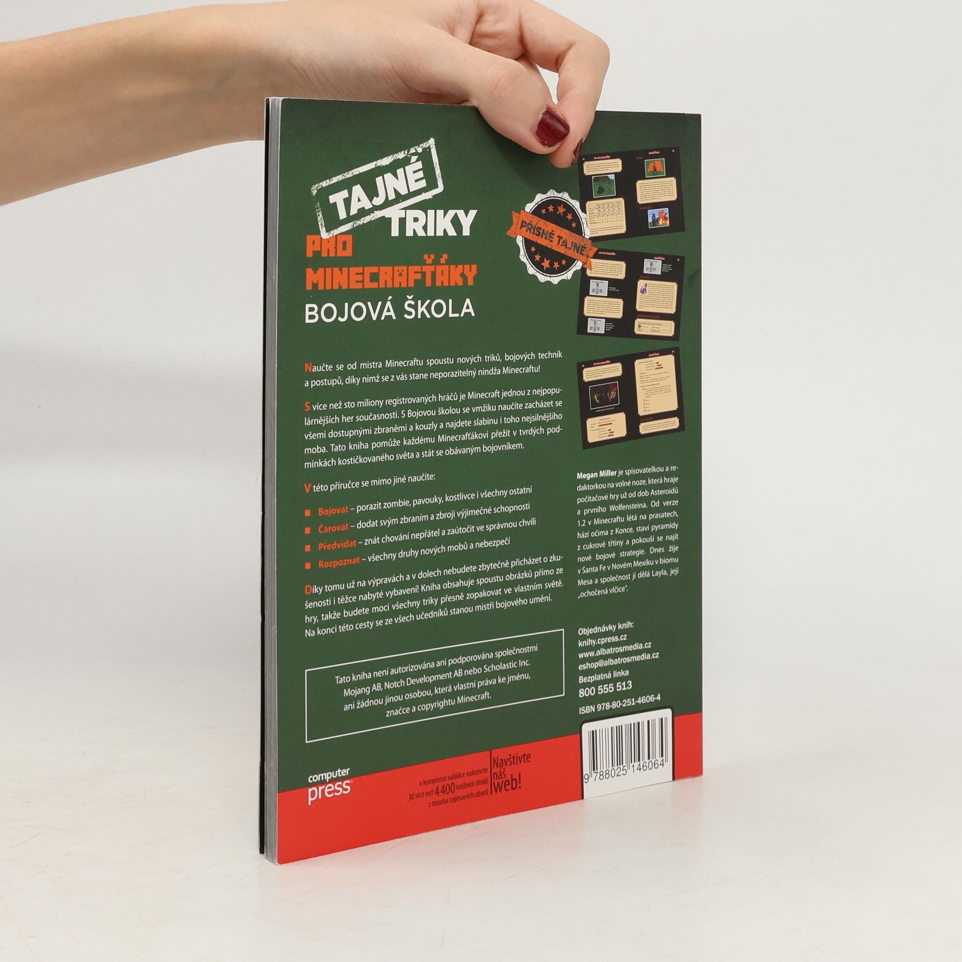 Tato kniha není autorizována ani podporována společnostmi Mojang AB, Notch Development AB nebo Scholastic Inc. Naučte se od mistra Minecraftu nové triky, bojové techniky a postupy, které vás promění v neporazitelného nindžu Minecraftu! S více než sto miliony registrovaných hráčů je Minecraft jednou z nejpopulárnějších her. S Bojovou školou se naučíte zacházet se zbraněmi a kouzly a najdete slabinu i nejsilnějších mobů. Tato příručka pomůže každému Minecrafťákovi přežít v tvrdých podmínkách a stát se obávaným bojovníkem. Naučíte se: - Bojovat – porazit zombie, pavouky a kostlivce - Čarovat – dodat zbraním a zbroji výjimečné schopnosti - Předvídat – znát chování nepřátel a zaútočit ve správnou chvíli - Rozpoznat – nové moby a nebezpečí. Díky tomu už na výpravách nebudete zbytečně přicházet o zkušenosti a vybavení! Kniha obsahuje spoustu obrázků přímo ze hry, abyste mohli triky přesně zopakovat ve svém světě. Na konci se ze všech učedníků stanou mistři bojového umění. Autorkou je Megan Miller, spisovatelka a redaktorka, která hraje počítačové hry od dob Asteroidů a nyní žije v Santa Fe v Novém Mexiku.