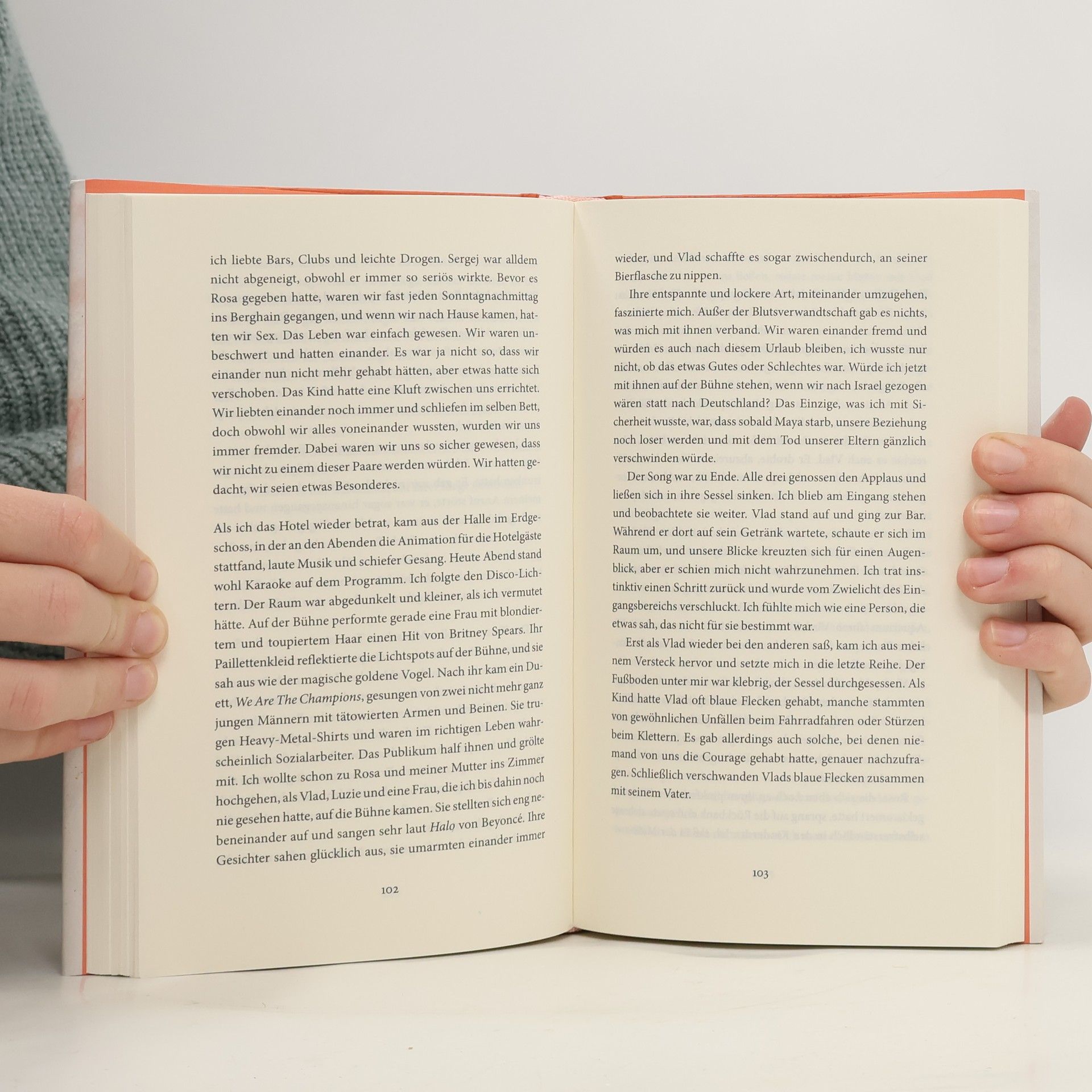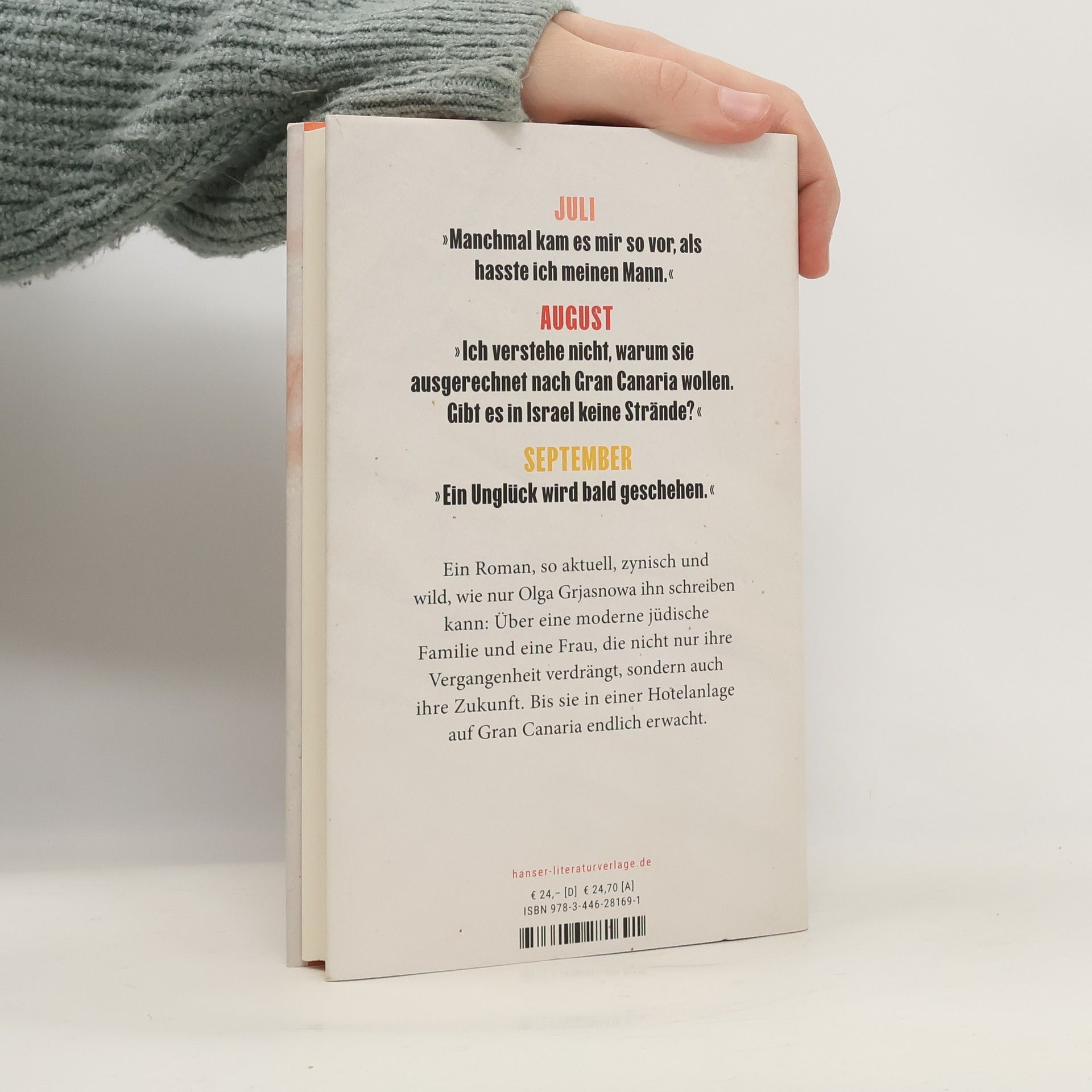 Lou, eine jüdische Frau in Berlin, sucht nach ihrer Identität und Familientraditionen, als sie zum 90. Geburtstag ihrer Tante auf Gran Canaria reist. Dort trifft sie ihren ex-sowjetischen Clan, der von Missgunst geprägt ist. Durch Alkohol und Erinnerungen erkennt Lou, dass die Antworten in Tel Aviv liegen. Ein zynischer und unterhaltsamer Roman von Olga Grjasnowa.