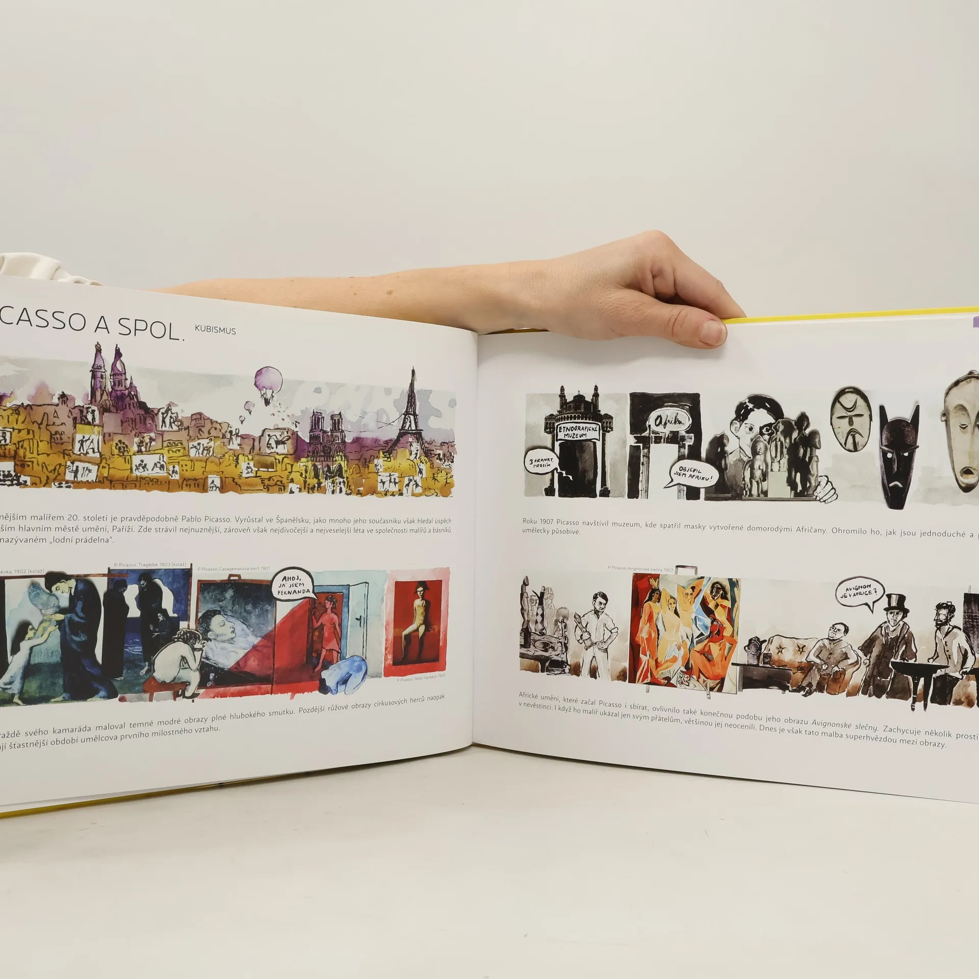 Komiksová kniha o umění moderny vznikla ve spolupráci Katedry výtvarné výchovy PdF MU a galerie OFF/FORMAT. Autoři - učitelé, kurátoři a výtvarníci přepsali moderní dějiny do několika vět a bublin a rozstříhali staré učebnice, aby reprodukce obrazů vytvořily co nejvěrnější kulisy pro osudy jejich tvůrců. Kniha obsahuje 13 příběhů, které s vtipem přibližují díla moderního umění žákům vyššího stupně základních a středních škol, a stává se tak vhodnou pomůckou v rukou učitele či rodiče. Pro potřeby škol se autoři přidrželi členění knihy do zavedených výtvarných směrů, dali jim však nové přiléhavé názvy (např. Secese – Přidej orchidej, Expresionismus – Výkřik, Pop-Art – Plechovky a hvězdy…) A jak správně vyslovit jména zahraničních umělců? Objevíte na předsádkách knihy