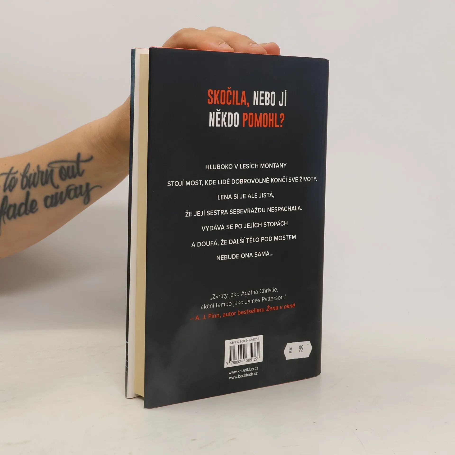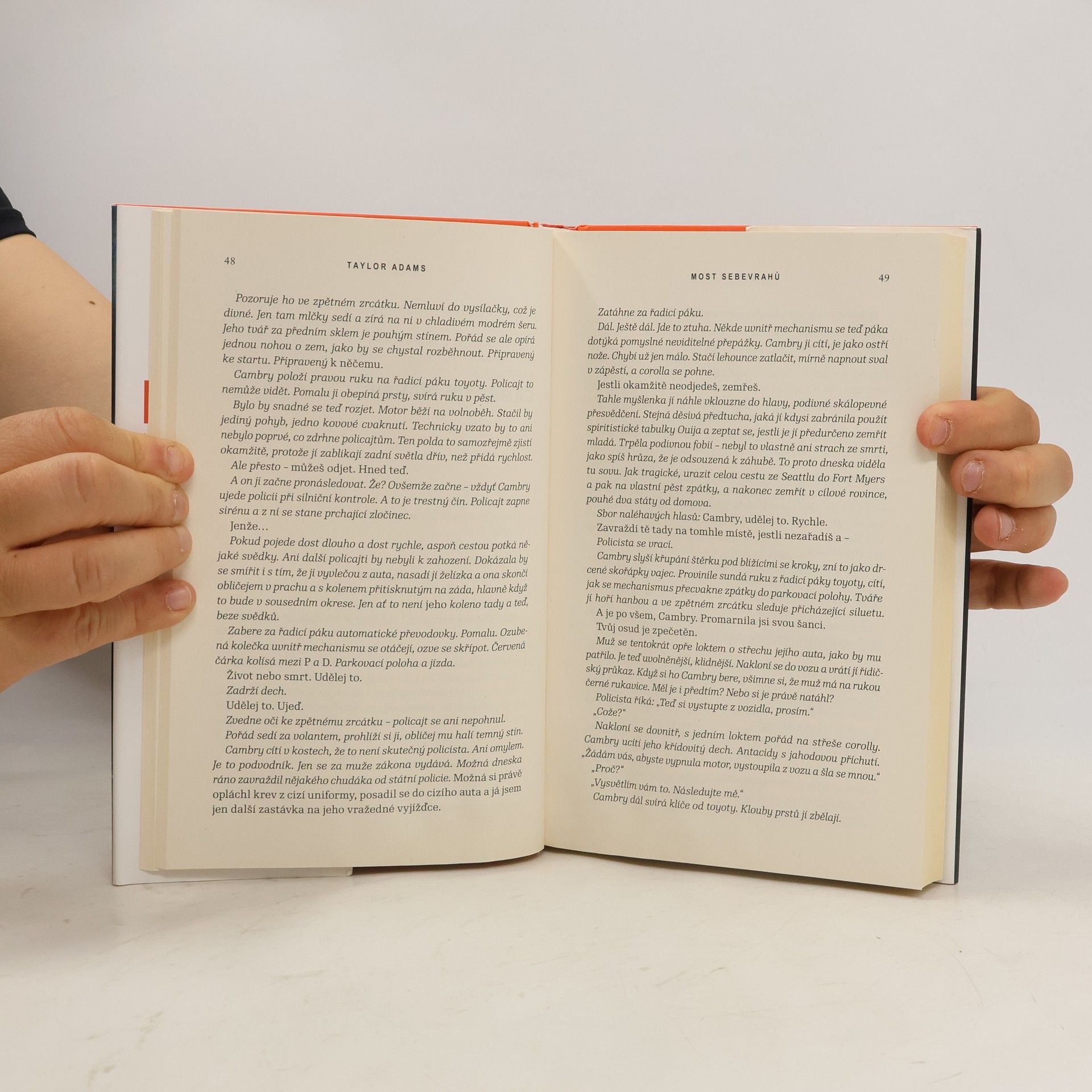 Lenina sestra, dvojče, se zabila skokem z mostu. Jenže Lena této oficiální policejní verzi nevěří a je odhodlaná udělat cokoli, aby odhalila pravdu. A tak se rozhodne setkat se s policistou, který údajně nalezl mrtvé tělo. Ovšem na jeho líčení něco nesedí. A jakmile se začnou vyjasňovat poslední hodiny života její sestry, změní se Lenino pátrání v trýznivý, neúprosný boj o vlastní život – boj, který prověří vše, co si myslela, že kdy věděla o ní, a především o sobě samé... Most sebevrahů je novým strhujícím psychologickým thrillerem talentovaného Taylora Adamse, autora akčních bestsellerů Není úniku a Na dostřel.