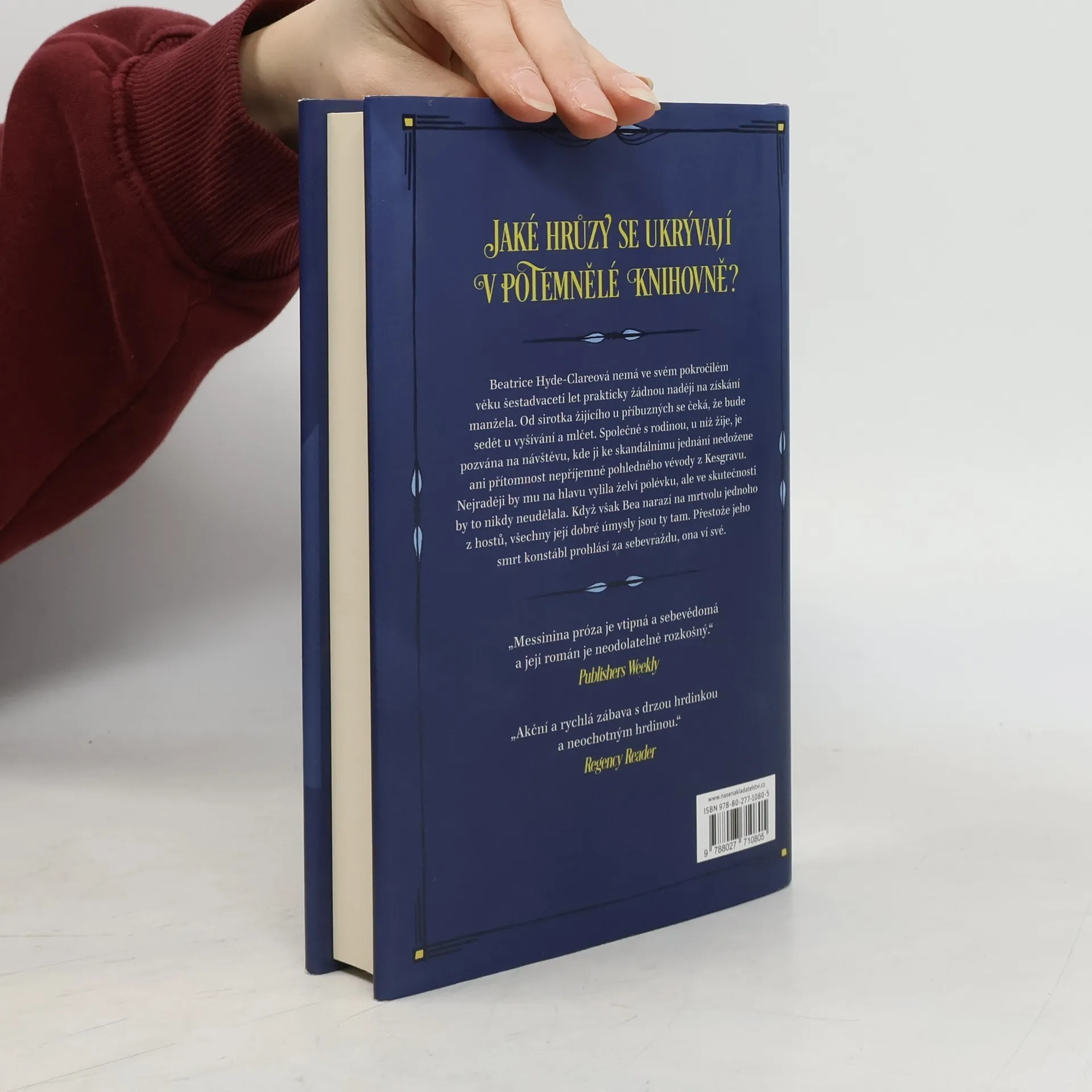Jaké hrůzy se ukrývají v potemnělé knihovně? Šestadvacetiletá Beatrice Hyde-Clareová je příliš plachá, aby se pustila do vyšetřování podezřelé smrti jednoho z hostů panského domu v Lake Districtu. Stará panna, která je neochotně trpěnou schovankou svých příbuzných, by se jistě neodvážila prohledávat pokoje syna vážené hostitelky a jeho urozeného přítele, jen aby získala usvědčující důkazy. Byla vychována k úctě a poslušnosti, takže by ji samozřejmě nikdy v životě nenapadlo vyslýchat panovačného vévodu z Kesgravu a už vůbec by si netroufla zpochybňovat způsob, jakým celou záležitost předložil místnímu konstáblovi. Jenže když v opuštěné knihovně venkovského sídla Skeffingtonových zakopne o zkrvavené tělo ubohého pana Otleyho, přesně tohle udělá.