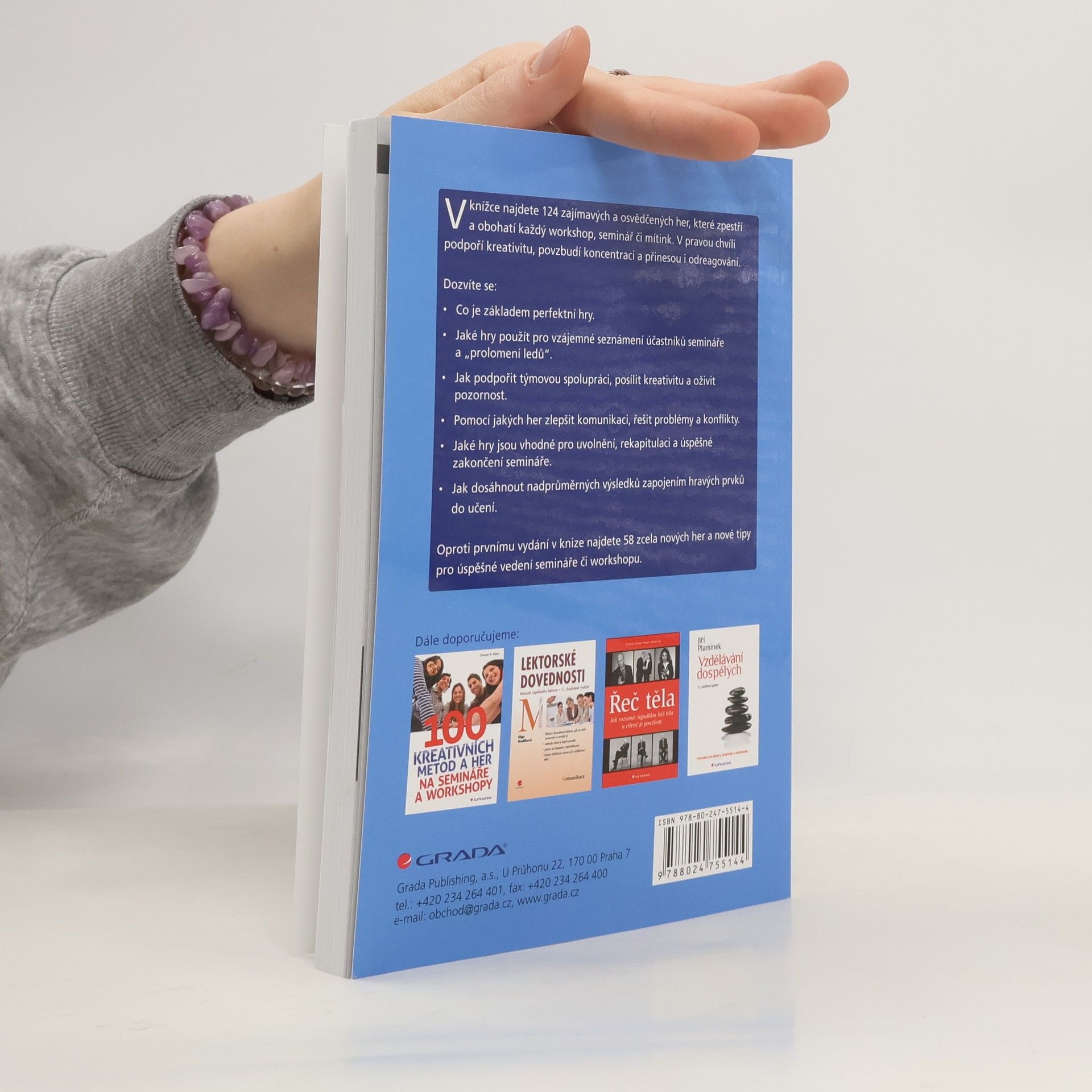 V knížce najdete 124 zajímavých a osvědčených her, které zpestří a obohatí každý workshop, seminář či mítink. V pravou chvíli podpoří kreativitu, povzbudí koncentraci a přinesou i odreagování. Dozvíte se: Co je základem perfektní hry. Jaké hry použít pro vzájemné seznámení účastníků semináře a „prolomení ledů“. Jak podpořit týmovou spolupráci, posílit kreativitu a oživit pozornost. Pomocí jakých her zlepšit komunikaci, řešit problémy a konflikty. Jaké hry jsou vhodné pro uvolnění, rekapitulaci a úspěšné zakončení semináře. Jak dosáhnout nadprůměrných výsledků zapojením hravých prvků do učení. Oproti prvnímu vydání v knize najdete 58 zcela nových her a nové tipy pro úspěšné vedení semináře či workshopu.