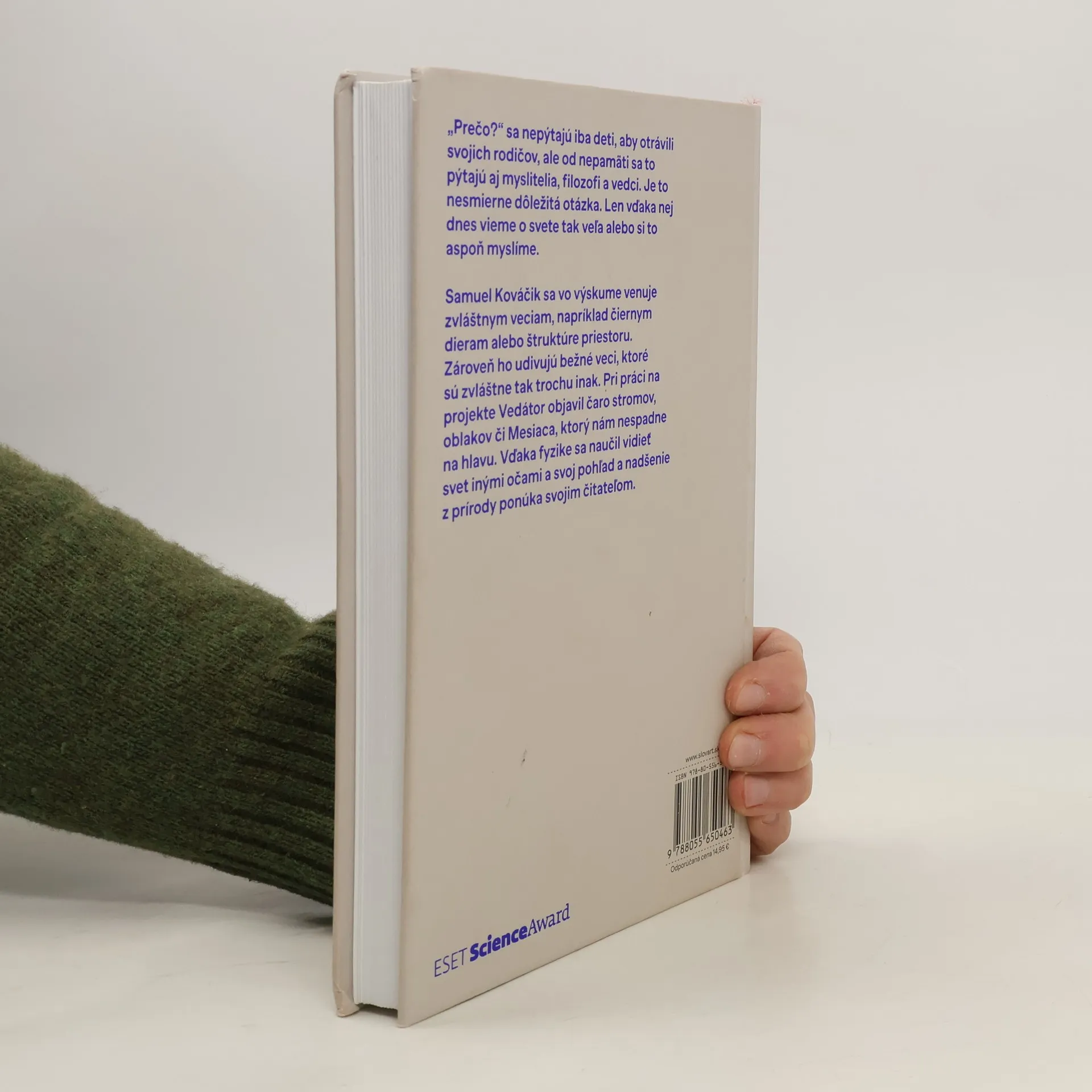 Prečo? sa nepýtajú iba deti, aby dokonale otrávili svojich rodičov, ale od nepamäti sa to pýtajú aj myslitelia, filozofi a vedci. Je to nesmierne dôležitá otázka, a len vďaka nej dnes vieme o svete pomerne veľa, alebo si to aspoň myslíme. Samuel Kováčik, fyzik, ktorý stojí za projektom Vedátor.sk, rozpráva o vede fascinujúcim spôsobom. A to bez jediného vzorca či rovnice. Vysvetľuje bežné veci okolo nás - prečo je rastlina zelená, prečo Mesiac nespadne, ako vzniká dúha, odkiaľ sa berú oblaky či snehové vločky, prečo máme ročné obdobia. Pre niekoho to môže byť nuda, no pre Samuela sú to obyčajné zázraky a pre rodičov to môžu byť odpovede na detskú otázku - Prečo?