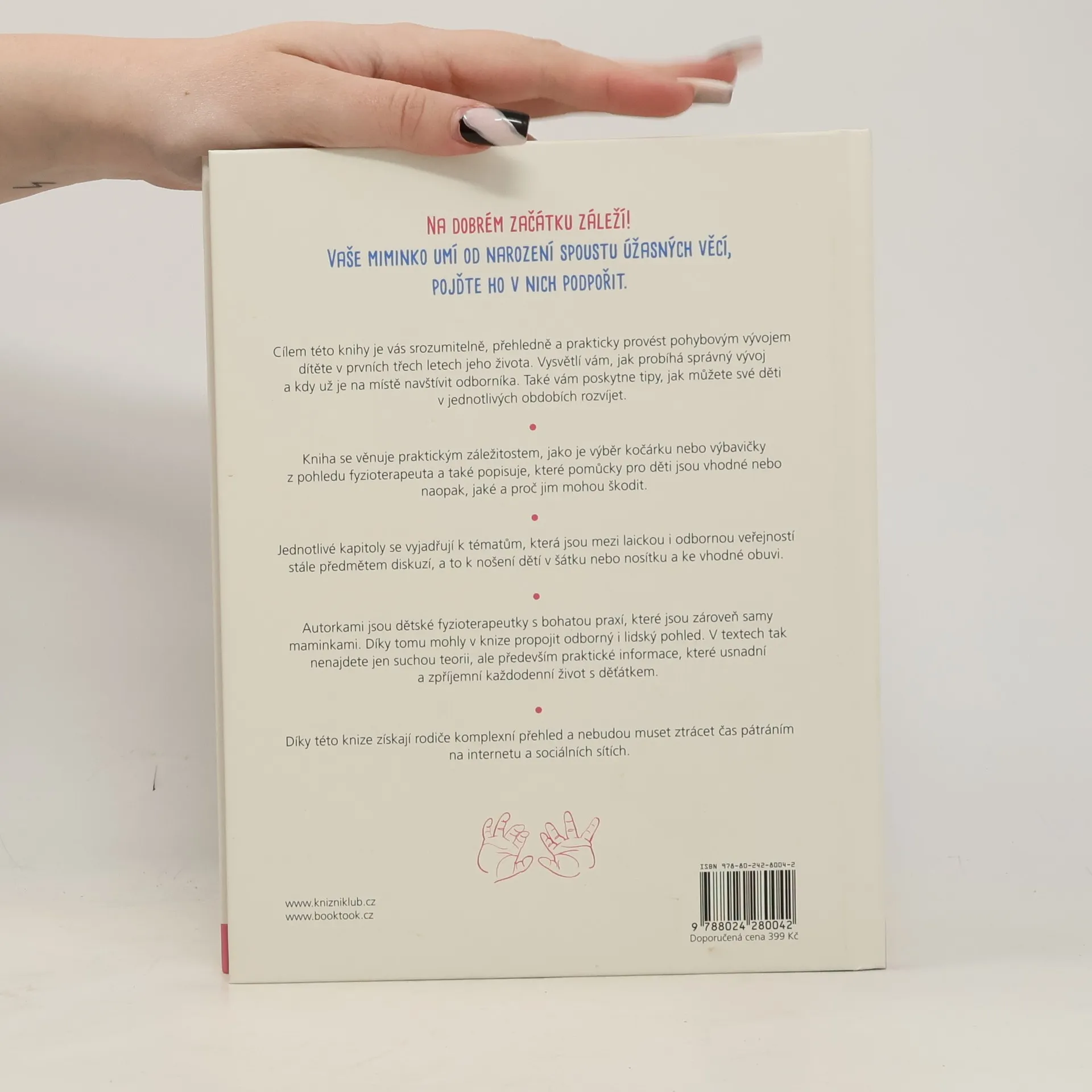 Na dobrém začátku záleží! Cílem této knihy, sepsané dvěma fyzioterapeutkami a zároveň maminkami malých dětí, je srozumitelně, přehledně a prakticky provést rodiče pohybovým vývojem jejich děťátka v prvních třech letech života. Vysvětluje, co je dobré sledovat a proč, kdy už je vhodné navštívit odborníka, i to, jak mohou rodiče své děti v jednotlivých obdobích rozvíjet. Publikace zároveň usnadňuje orientaci v často nepřeberném množství dětských pomůcek, které dnešní trh nabízí, včetně pomoci s výběrem správného kočárku či nosítka a později i vhodné obuvi.