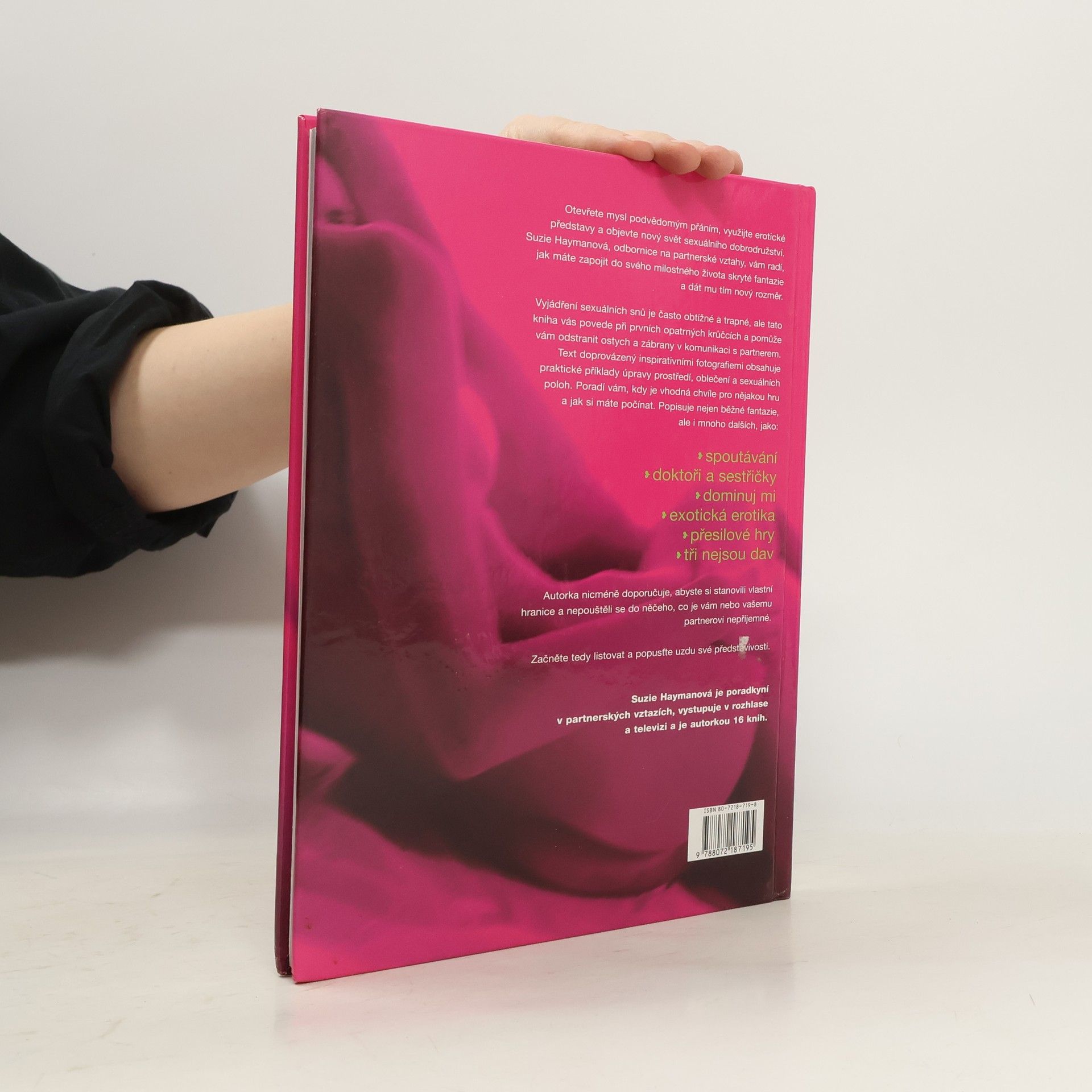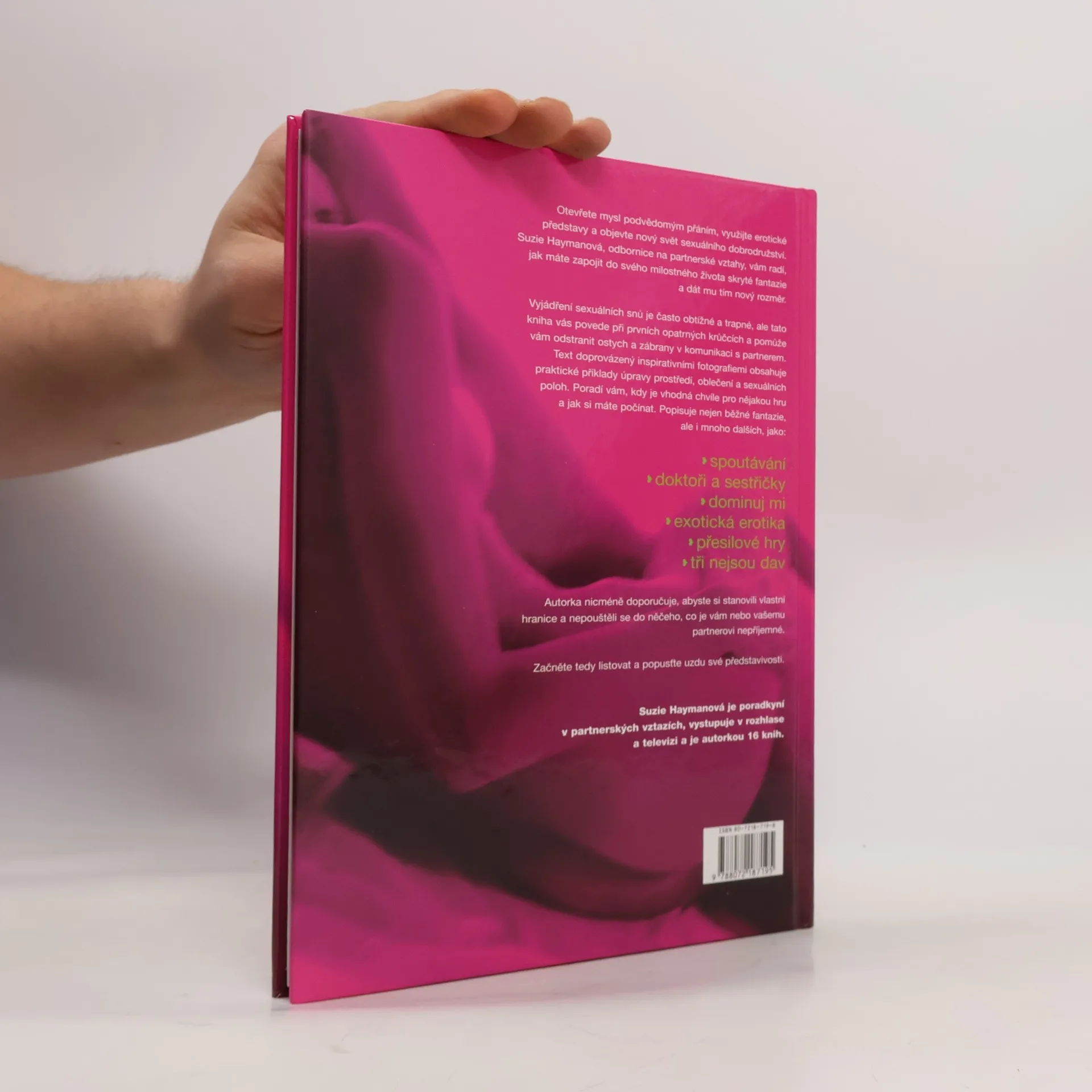 Otevřete mysl podvědomým přáním, využijte erotické představy a objevte nový svět sexuálního dobrodružství. Suzie Haymanová, odbornice na partnerské vztahy, vám radí, jak máte zapojit do svého milostného života skryté fantazie a dát mu tím nový rozměr. Vyjádření sexuálních snů je často obtížné a trapné, ale tato kniha vás povede při prvních opatrných krůčcích a pomůže vám odstranit ostych a zábrany v komunikaci s partnerem. Text doprovázený inspirativními fotografiemi obsahuje praktické příklady úpravy prostředí, oblečení a sexuálních poloh. Poradí vám, kdy je vhodná chvíle pro nějakou hru a jak si máte počínat. Popisuje nejen běžné fantazie, ale i mnoho dalších, jako: spoutávání • doktoři a sestřičky • dominuj mi • erotická erotika • přesilové hry • tři nejsou dav Autorka nicméně doporučuje, abyste si stanovili vlastní hranice a nepouštěli se do něčeho, co je vám nebo vašemu partnerovi nepříjemné. Začněte tedy listovat a popusťte uzdu své představivosti. Suzie Haymanová je poradkyní v partnerských vztazích, vystupuje v rozhlase a televizi a je autorkou 16 knih.