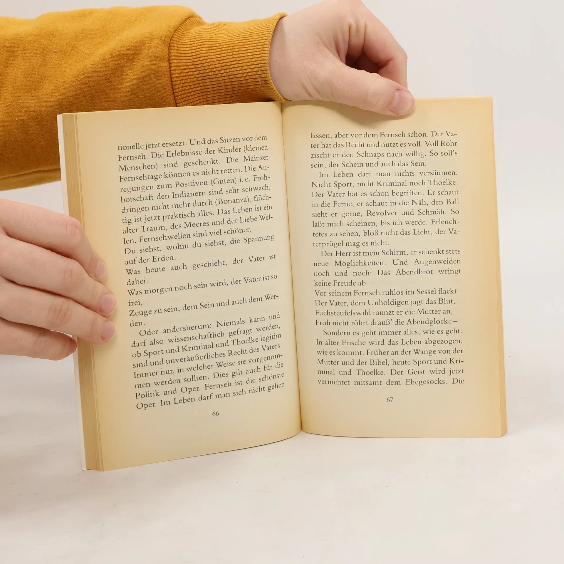 Beim Fressen beim Fernsehen fällt der Vater dem Kartoffel aus dem Maul. Roman, Eckhard Henscheid