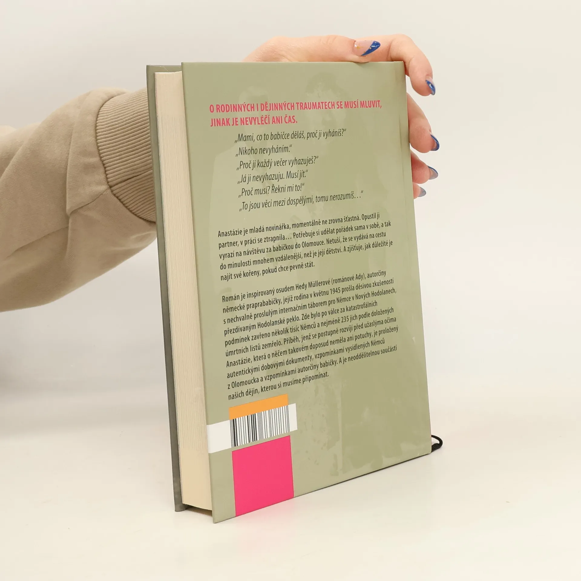 Anastázie je mladá novinářka, momentálně ne zrovna šťastná. Opustil ji partner, v práci se ztrapnila. Potřebuje si udělat pořádek sama v sobě, a tak vyrazí na návštěvu za babičkou do Olomouce. Netuší, že se vydává na cestu do minulosti mnohem vzdálenější, než je její vlastní dětství. A zjišťuje, jak důležité je najít své kořeny, pokud chce pevně stát. Román je inspirovaný osudem Hedy Müllerové, autorčiny německé praprababičky, jejíž rodina v květnu 1945 prošla děsivou zkušeností s nechvalně proslulým internačním táborem pro Němce v Nových Hodolanech, přezdívaným Hodolanské peklo. Zde bylo po válce za katastrofálních podmínek zavřeno několik tisíc Němců a nejméně 235 jich podle doložených úmrtních listů zemřelo. Příběh, jenž se postupně rozvíjí před užaslýma očima Anastázie, která o něčem takovém doposud neměla ani potuchy, je proložený autentickými dobovými dokumenty, vzpomínkami vysídlených Němců z Olomoucka, zážitky lidí internovaných ve sběrných táborech a vzpomínkami autorčiny babičky. A je neoddělitelnou součástí našich dějin, kterou si musíme připomínat.