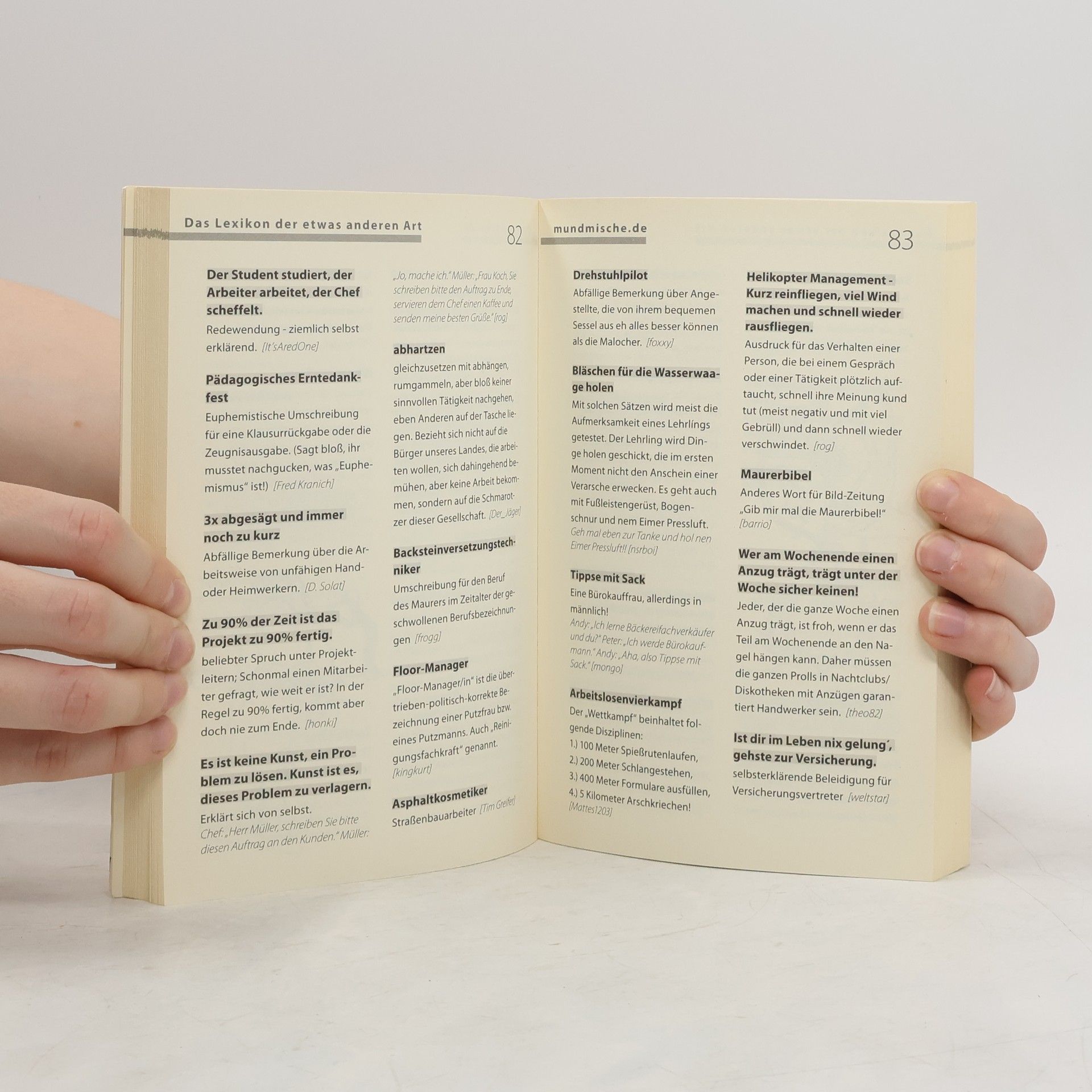 Das Buch präsentiert eine Sammlung humorvoller Wortneuschöpfungen und Sprüche von der Internetseite www.Mundmische.de. Es bietet ein unterhaltsames Sammelsurium zum Lachen, ideal für verschiedene Gelegenheiten.