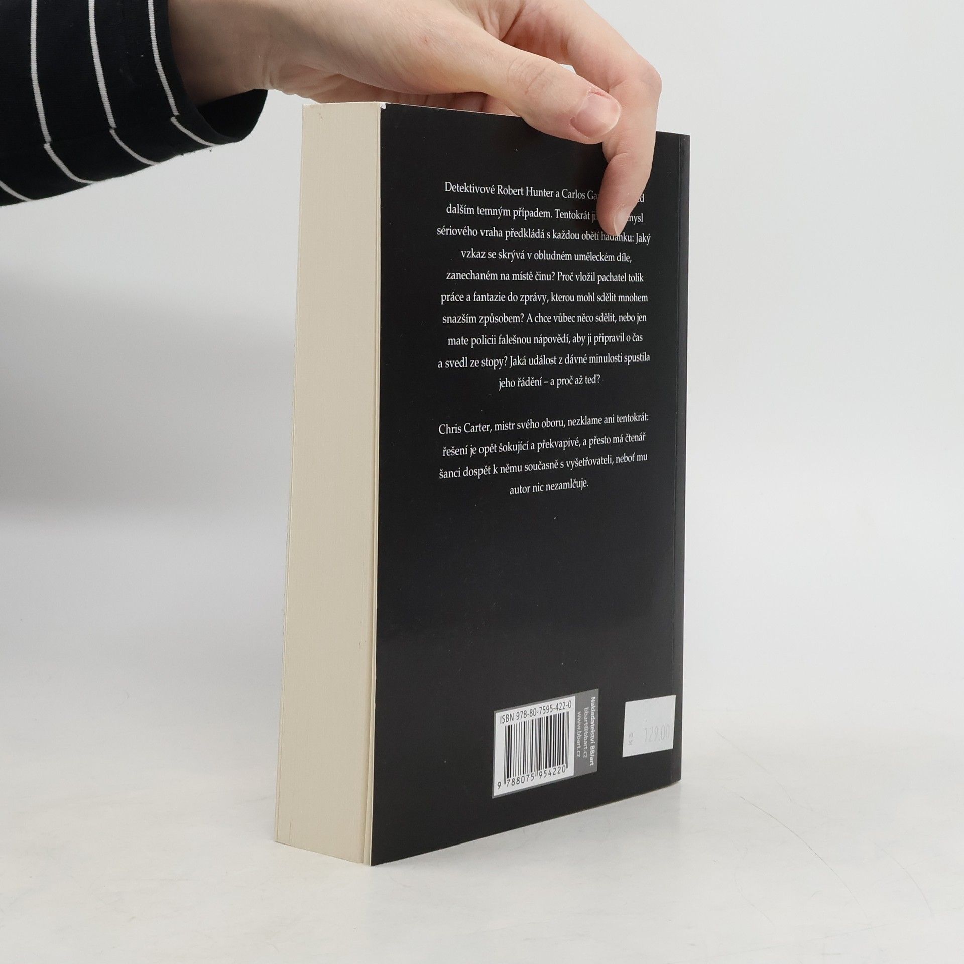 Detektivové Robert Hunter a Carlos Garcia stojí před dalším temným případem. Tentokrát jim chorá mysl sériového vraha předkládá s každou obětí hádanku: Jaký vzkaz se skrývá v obludném uměleckém díle, zanechaném na místě činu? Proč vložil pachatel tolik práce a fantazie do zprávy, kterou mohl sdělit mnohem snazším způsobem? A chce vůbec něco sdělit, nebo jen mate policii falešnou nápovědí, aby ji připravil o čas a svedl ze stopy? Jaká událost z dávné minulosti spustila jeho řádění – a proč až teď? Chris Carter, mistr svého oboru, nezklame ani tentokrát: řešení je opět šokující a překvapivé, a přesto má čtenář šanci dospět k němu současně s vyšetřovateli, neboť mu autor nic nezamlčuje.