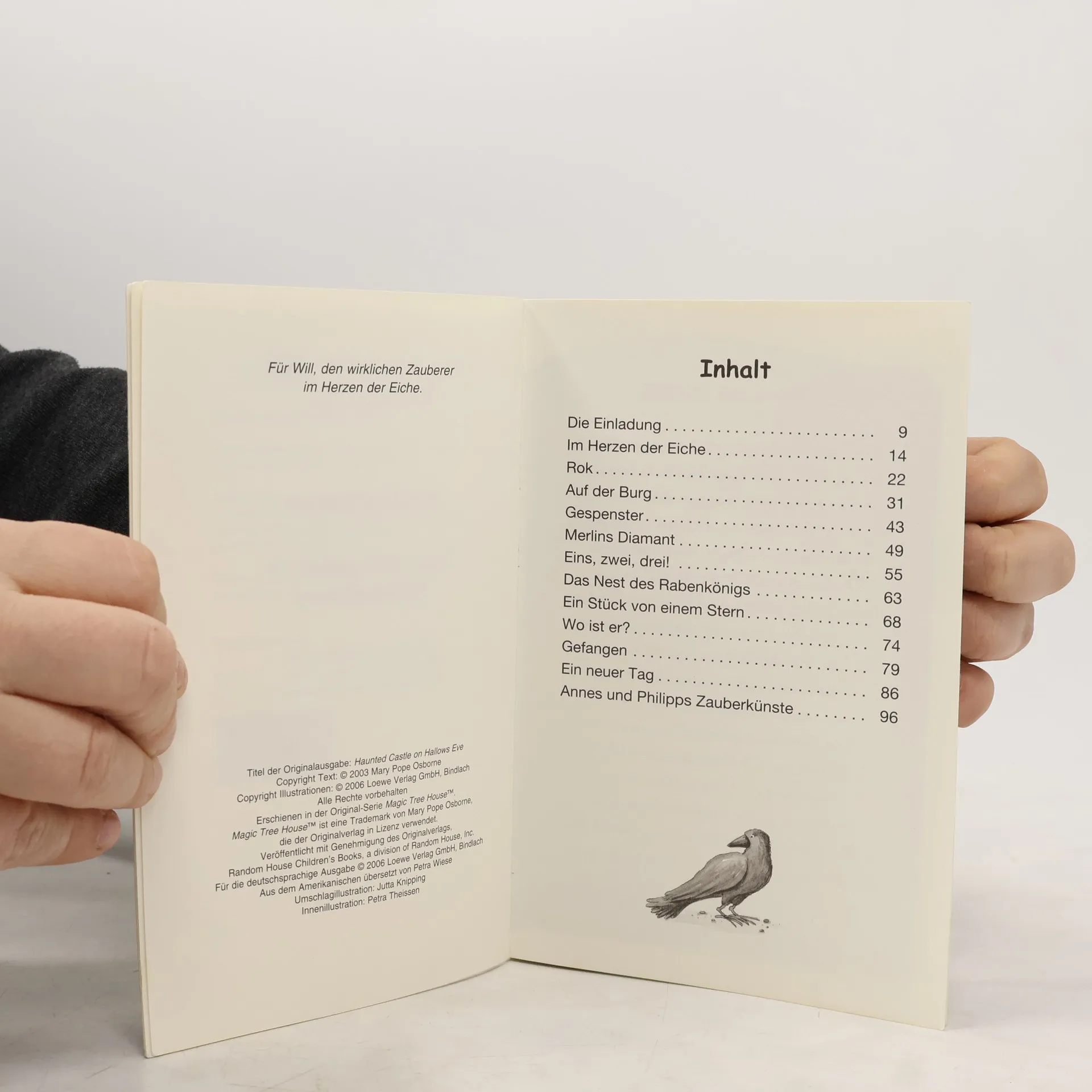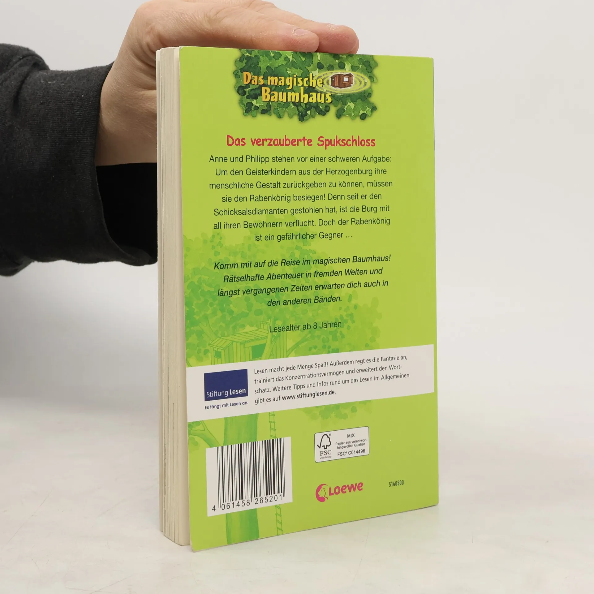 Das Buch ist bei deiner Buchhandlung vor Ort und bei vielen Online-Buchshops erhältlich! + Bücher, die Kinder gerne lesen wollen + Beliebte Themen: Abenteuer, Tiere und fremde Länder + Hochwertiges Hardcover + Mit vielen Illustrationen + Bereits über 10 Millionen verkaufte Bücher der Baumhaus-Reihe + Ausgewogenes Text-Bild-Verhältnis + Große Schrift + Kurze Kapitel + Anne und Phillip stehen vor einer schweren Aufgabe: Um den Geisterkindern aus der Herzogenburg ihre menschliche Gestalt zurückgeben zu können, müssen sie den Rabenkönig besiegen! Denn seit er den Schicksalsdiamanten gestohlen hat, ist die Burg mit allen ihren Bewohnern verflucht. Doch der Rabenkönig ist ein gefährlicher Gegner! Komm mit auf die Reise im magischen Baumhaus! Rätselhafte Abenteuer in fremden Welten und längst vergangenen Zeiten erwarten dich auch in den nächsten Bänden. Die beliebte Kinderbuch-Reihe von Bestsellerautorin Mary Pope Osborne! Die Geschwister Anne und Philipp reisen mit dem magischen Baumhaus durch die Zeit. Sie erleben spannende Abenteuer, entdecken ferne Länder und lernen viele berühmte Persönlichkeiten kennen. Mehr Infos zur Reihe und tolle Extras unter: www. MagischesBaumhaus. de