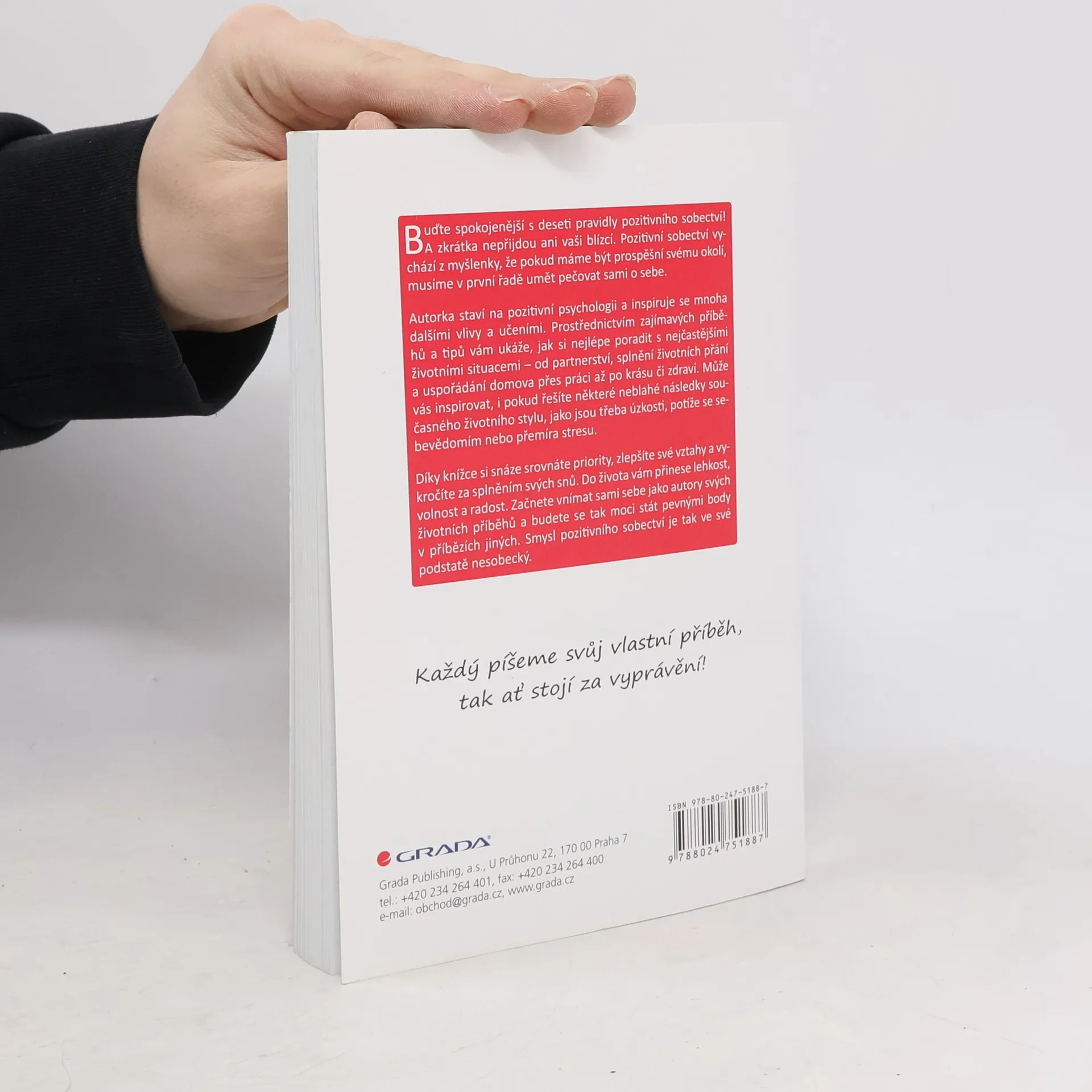 Buďte spokojenější s deseti pravidly pozitivního sobectví! A zkrátka nepřijdou ani vaši blízcí. Přístup pravidel vychází z myšlenky, že abychom se mohli zabývat světem okolo a dokázali se starat o své blízké, musíme být především schopni důvěřovat sami sobě. Autorka staví na pozitivní psychologii a inspiruje se mnoha dalšími vlivy a učeními. Prostřednictvím zajímavých příběhů a tipů vám ukáže, jak si nejlépe poradit s nejčastějšími životními situacemi – od partnerství, splněných přání a uspořádání domova přes práci až po krásu či zdraví. Může vám pomoci také při potížích, které souvisejí se současným životním stylem, jako jsou úzkostné poruchy a problémy se sebevědomím, nebo při hledání životní vize. Díky knížce si snáze srovnáte priority, zlepšíte své vztahy a vykročíte za splněním svých snů. Začnete vnímat sami sebe jako autory svých životních příběhů a budete se tak moci stát pevným body v příbězích jiných. Smysl pozitivního sobectví je tak ve své podstatě nesobecký. Každý píšeme svůj vlastní příběh, tak ať stojí za vyprávění!