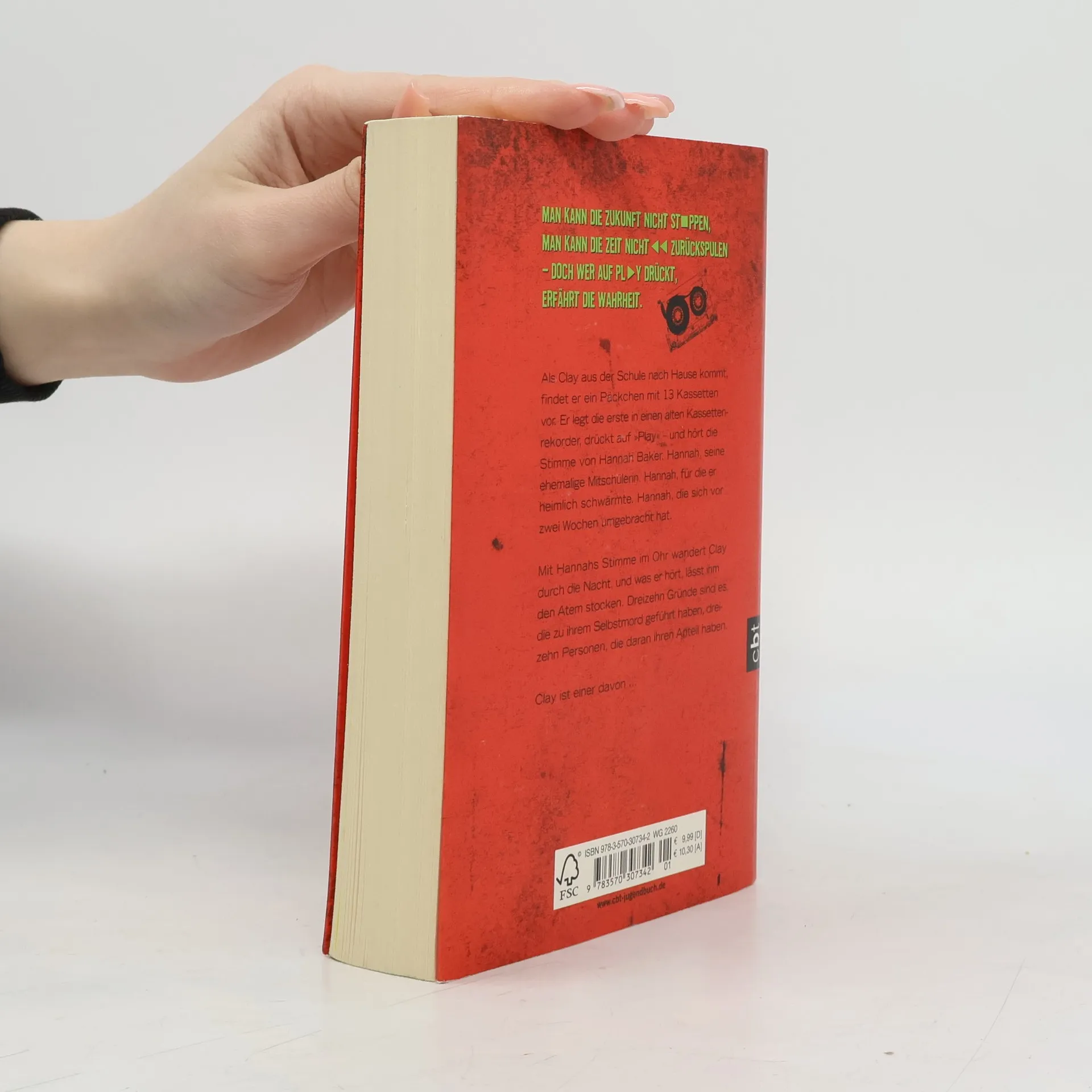 Die Stimme der Toten, ein Ruf nach Leben Als Clay Jensen aus der Schule nach Hause kommt, findet er ein Päckchen mit 13 Kassetten vor. Er legt die erste in einen alten Kassettenrekorder, drückt auf „Play“ - und hört die Stimme von Hannah Baker. Hannah, seine ehemalige Mitschülerin. Hannah, für die er heimlich schwärmte. Hannah, die sich vor zwei Wochen umgebracht hat. Mit ihrer Stimme im Ohr wandert Clay durch die Nacht, und was er hört, lässt ihm den Atem stocken. Dreizehn Gründe sind es, die zu ihrem Selbstmord geführt haben, dreizehn Personen, die daran ihren Anteil haben. Clay ist einer davon. Ein Roman, der unter die Haut geht.