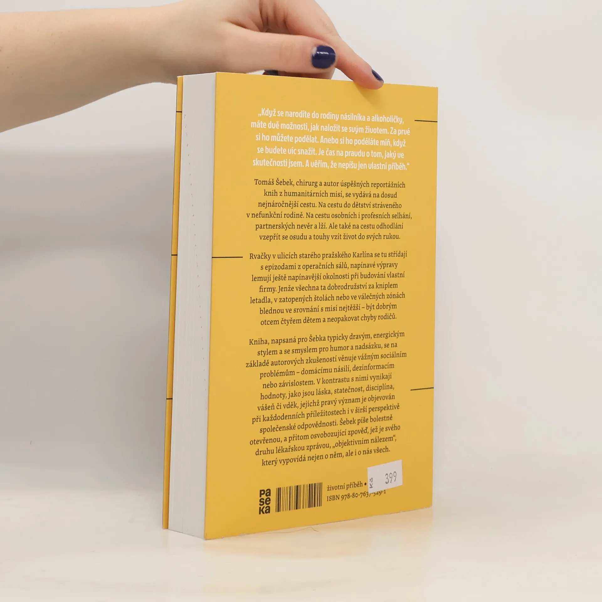 Tomáš Šebek, chirurg a autor úspěšných reportážních knih z humanitárních misí, se vydává na dosud nejnáročnější cestu. Na cestu do dětství stráveného v nefunkční rodině. Na cestu osobních i profesních selhání, partnerských nevěr a lží. Ale také na cestu odhodlání vzepřít se osudu a touhy vzít život do svých rukou. Rvačky v ulicích starého pražského Karlína se tu střídají s epizodami z operačních sálů, napínavé výpravy lemují ještě napínavější okolnosti při budování vlastní firmy. Jenže všechna ta dobrodružství za kniplem letadla, v zatopených štolách nebo ve válečných zónách blednou ve srovnání s misí nejtěžší – být dobrým otcem čtyřem dětem a neopakovat chyby rodičů. Kniha, napsaná pro Šebka typicky dravým, energickým stylem a se smyslem pro humor a nadsázku, se na základě autorových zkušeností věnuje vážným sociálním problémům – domácímu násilí, dezinformacím nebo závislostem. V kontrastu s nimi vynikají hodnoty, jako jsou láska, statečnost, disciplína, vášeň či vděk, jejichž pravý význam je objevován při každodenních příležitostech i v širší perspektivě společenské odpovědnosti. Šebek píše bolestně otevřenou, a přitom osvobozující zpověď, jež je svého druhu lékařskou zprávou, „objektivním nálezem“, který vypovídá nejen o něm, ale i o nás všech.
