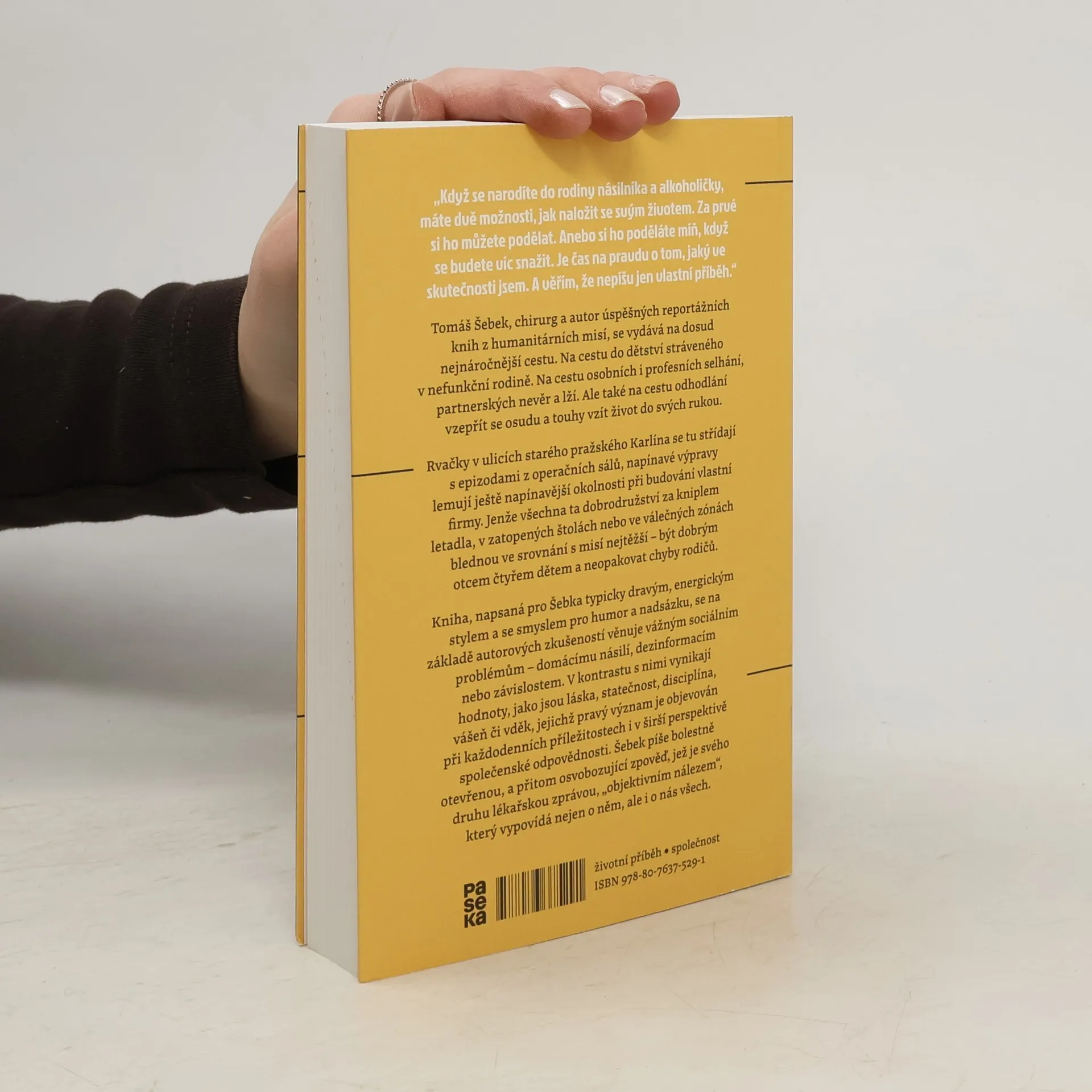Tomáš Šebek, chirurg a autor úspěšných reportážních knih z humanitárních misí, se vydává na dosud nejnáročnější cestu. Na cestu do dětství stráveného v nefunkční rodině. Na cestu osobních i profesních selhání, partnerských nevěr a lží. Ale také na cestu odhodlání vzepřít se osudu a touhy vzít život do svých rukou. Rvačky v ulicích starého pražského Karlína se tu střídají s epizodami z operačních sálů, napínavé výpravy lemují ještě napínavější okolnosti při budování vlastní firmy. Jenže všechna ta dobrodružství za kniplem letadla, v zatopených štolách nebo ve válečných zónách blednou ve srovnání s misí nejtěžší – být dobrým otcem čtyřem dětem a neopakovat chyby rodičů. Kniha, napsaná pro Šebka typicky dravým, energickým stylem a se smyslem pro humor a nadsázku, se na základě autorových zkušeností věnuje vážným sociálním problémům – domácímu násilí, dezinformacím nebo závislostem. V kontrastu s nimi vynikají hodnoty, jako jsou láska, statečnost, disciplína, vášeň či vděk, jejichž pravý význam je objevován při každodenních příležitostech i v širší perspektivě společenské odpovědnosti. Šebek píše bolestně otevřenou, a přitom osvobozující zpověď, jež je svého druhu lékařskou zprávou, „objektivním nálezem“, který vypovídá nejen o něm, ale i o nás všech.