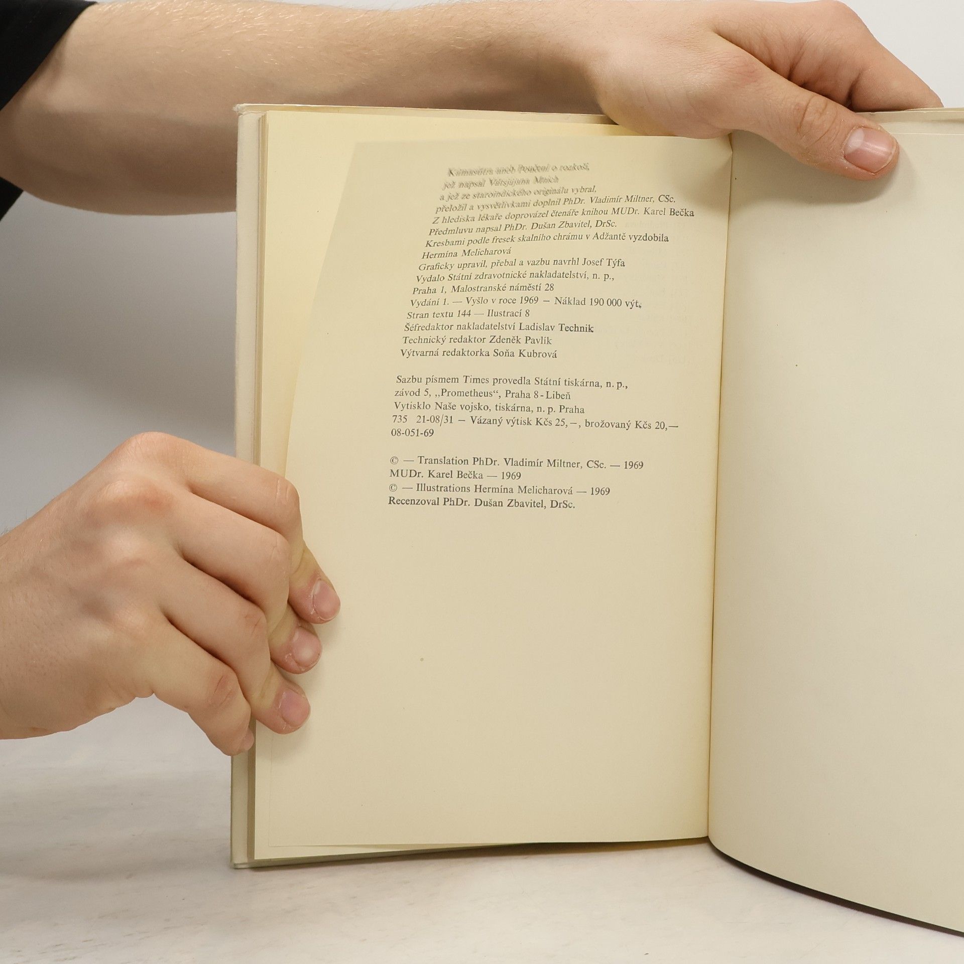 Toto je první kniha Kámasútry přeložená přímo ze staroindického originálu, která vyšla poprvé v Československu v roce 1969, bohužel některé části byly vypuštěny díky komunistickým cenzorům. Knihu přeložil a vysvětlivkami doplnil PhDr. Vladimír Miltner, CSc. Z hlediska lékaře doprovázel čtenáře knihou MUDr. Karel Bečka. Kresbami podle fresek vyzdobila Hermína Melicharová. Vátsjájanova Kámasútra, která vznikla někdy ve. 4.-5: století našeho letopočtu, je nejstarším dochovaným spisem, jenž se vědecky zabývá rozkoší, jedním z trojího smyslu života. Trochu zjednodušeně řečeno - je to podrobná učebnice lásky, v níž autor, odvolávaje se často na starší své předchůdce v tomto vědním oboru, podává ucelené poučení o milostném hemžení ve staré Indii.