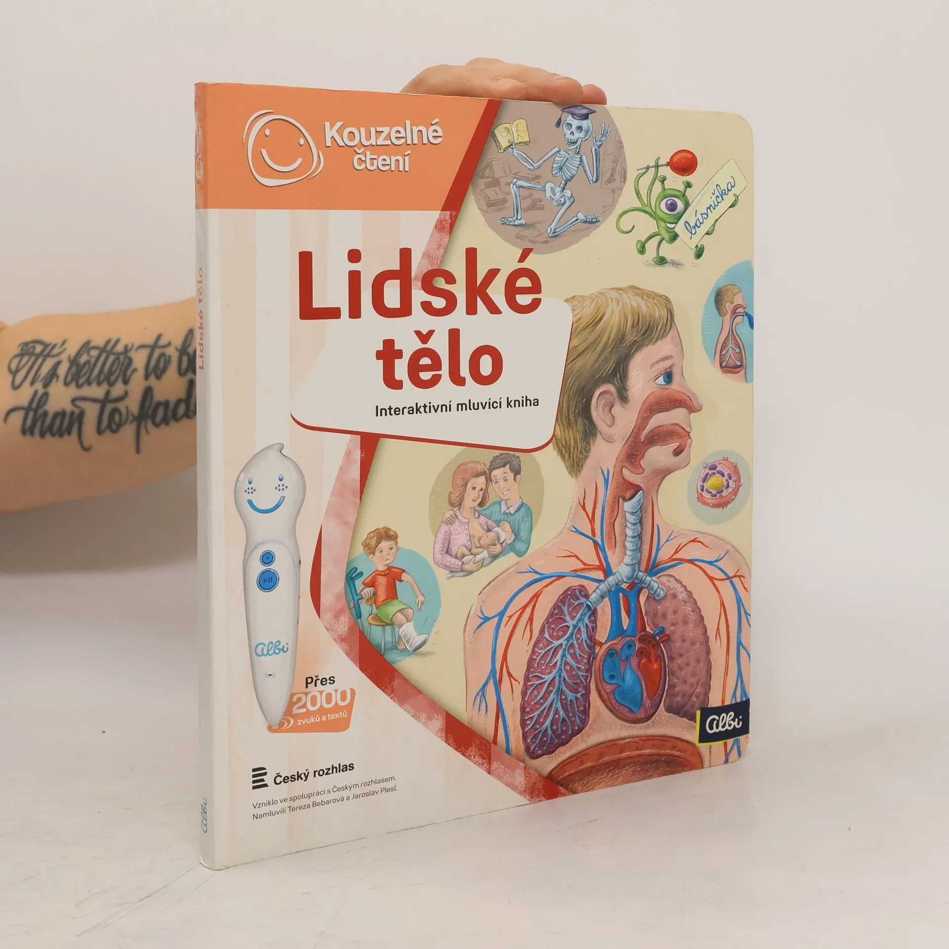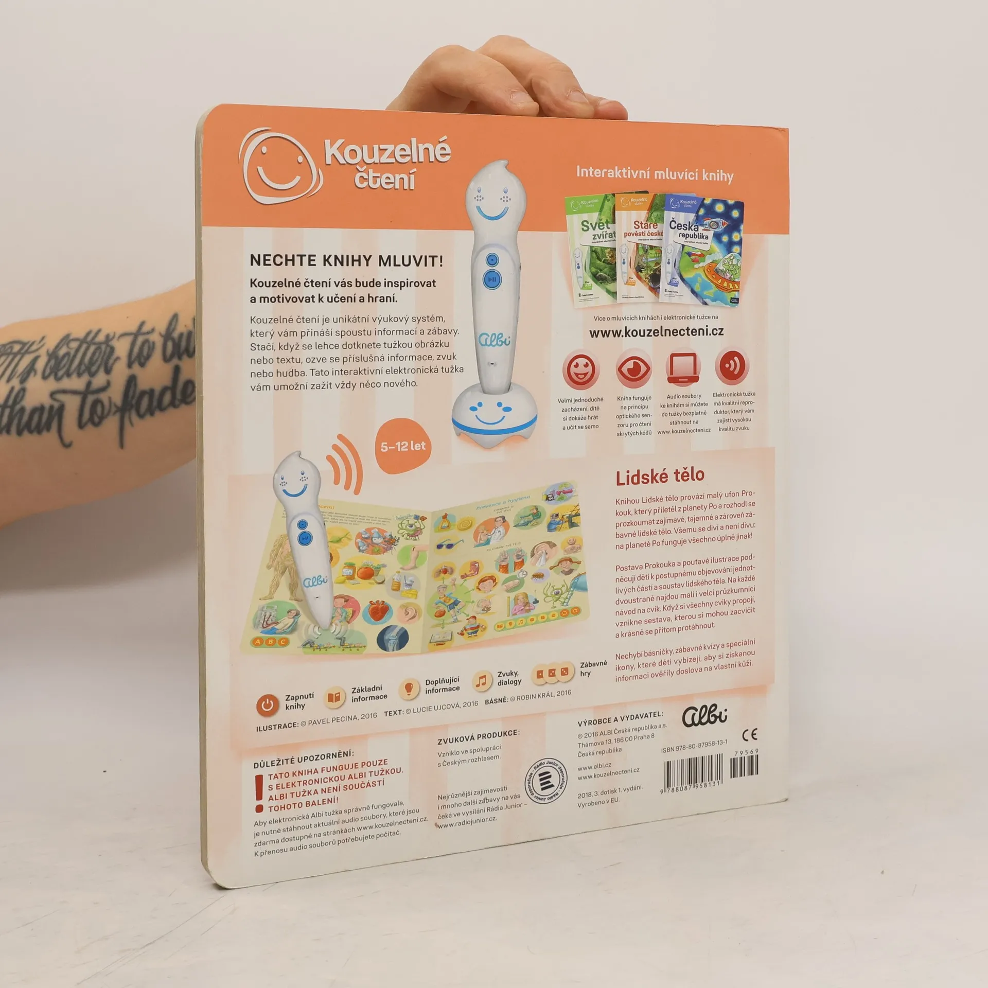 Interaktivní mluvící kniha z edice Kouzelné čtení, se kterou se děti již od 3 let dozvědí spoustu zajímavých a užitečných informací o našem těle. Knihou Lidské tělo provází malý ufon Prokouk, který přiletěl z planety Po, aby prozkoumal taje lidského těla. Všemu se diví a není divu: na planetě Po funguje všechno úplně jinak! Postava Prokouka a poutavé ilustrace podněcují děti k postupnému objevování jednotlivých částí a soustav lidského těla. Kniha je členěna do 8 kapitol a témata jsou např. Kosti a svaly, Mozek a nervy, Rozmnožování, Trávicí soustava, Srdce a plíce atd. Na každé dvoustraně najdou malí i velcí průzkumníci návod na cvik. Když si všechny cviky propojí, vznikne sestava, kterou si mohou zacvičit a krásně se přitom protáhnout. V knize Lidské tělo najdete také básničky, zábavné kvízy a speciální ikony, které děti vybízí, aby si získanou informaci zkusili doslava na vlastní kůži. Kniha obsahuje téměř 2000 zvuků a textů. Knihu ilustroval Pavel Pecina, básničky napsal Robin Král, texty Lucie Ujcová. Vzniklo ve spolupráci s Českým rozhlasem, knihu namluvili Tereza Bebarová a Jaroslav Plesl.