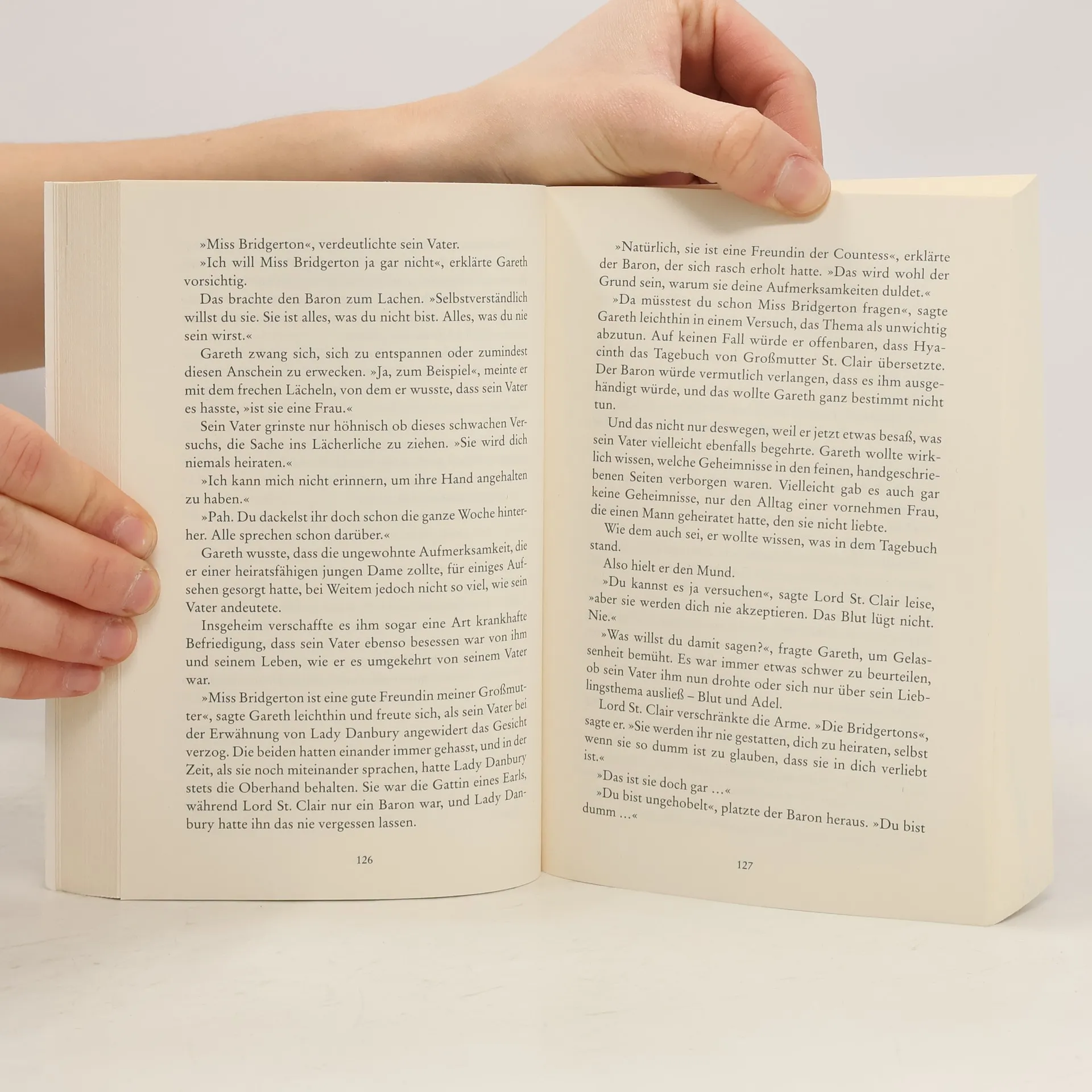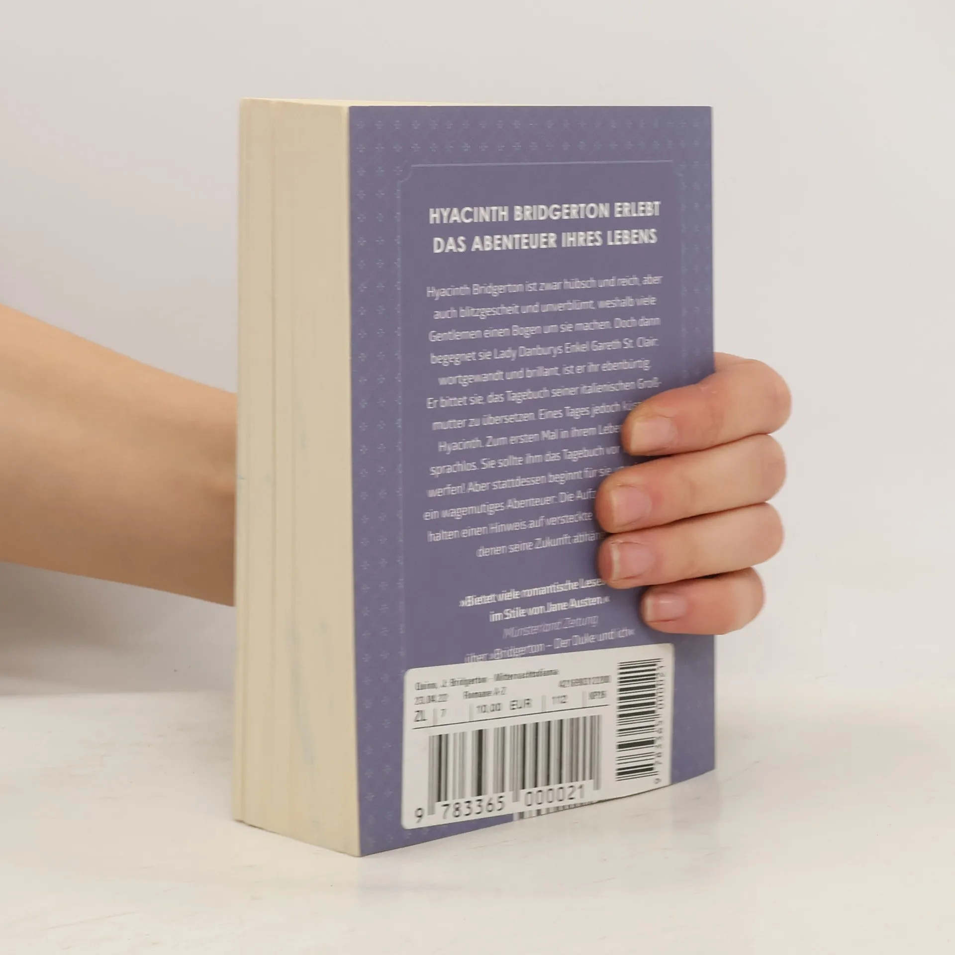 Hyacinth Bridgerton erlebt das Abenteuer ihres Lebens Hyacinth Bridgerton ist zwar hübsch und reich, aber auch blitzgescheit und unverblümt, weshalb viele Gentlemen einen Bogen um sie machen. Doch dann begegnet sie Lady Danburys Enkel Gareth St. Clair: wortgewandt und brillant, ist er ihr ebenbürtig. Er bittet sie, das Tagebuch seiner italienischen Großmutter zu übersetzen. Eines Tages jedoch küsst er Hyacinth. Zum ersten Mal in ihrem Leben ist sie sprachlos. Sie sollte ihm das Tagebuch vor die Füße werfen! Aber stattdessen beginnt für sie und Gareth ein wagemutiges Abenteuer: Die Aufzeichnungen enthalten einen Hinweis auf versteckte Diamanten, von denen seine Zukunft abhängt ... »Bietet viele romantische Lesestunden im Stile von Jane Austen.« Münsterland Zeitung über »Bridgerton– Der Duke und ich« »Das siebte und zweitletzte Buch der Bridgerton-Reihe fesselt mehr denn je.« Tize