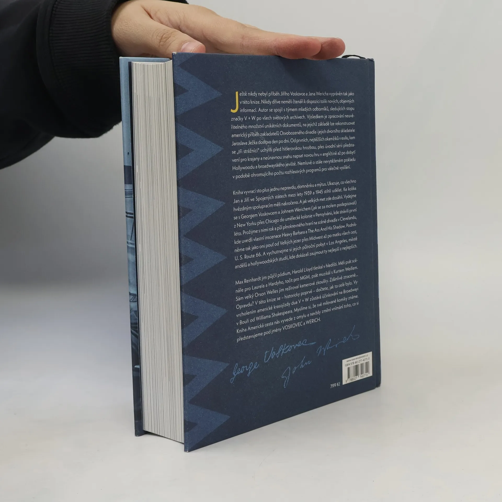 Ještě nikdy nebyl příběh Jiřího Voskovce a Jana Wericha vyprávěn tak jako v této knize. Autor se spojil s týmem mladých odborníků, sledujících stopu značky V + W po všech světových archivech. Výsledkem je zpracování neuvěřitelného množství unikátních dokumentů, na jejichž základělze rekonstruovat americký příběh zakladatelů Osvobozeného divadla i jejich dvorního skladatele Jaroslava Ježka doslova den po dni. Kniha vyvrací sto plus jednu nepravdu, domněnku a mýtus. Ukazuje, co všechno Jan a Jiří ve Spojených státech dokázali. Kdo z legend jim pomáhal a fandil. A jak velkých met zde dosáhli. Vydejme se s Georgem Voskovcem a Johnem Werichem (jak se za mořem podepisovali) z New Yorku přes Chicago do umělecké kolonie v Pensylvánii. Prožijme s nimi rok a půl hraní na scéně divadla v Clevelandu, kde uvedli vlastní inscenace. Podnikněme tak jako oni dobrodružnou pouť od Velkých jezer přes Midwest až po matku všech cest, U. S. Route 66. A vychutnejme si jejich půlroční pobyt v Los Angeles, kde dokázali zaujmout ty nejlepší z nejlepších. V této knize se – historicky poprvé – dočtete, jak to celé bylo. Myslíme si, že své milované komiky známe. Kniha Americká cesta nás vyvede z omylu a navždy změní vnímání toho, co si představujeme pod jmény VOSKOVEC a WERICH.