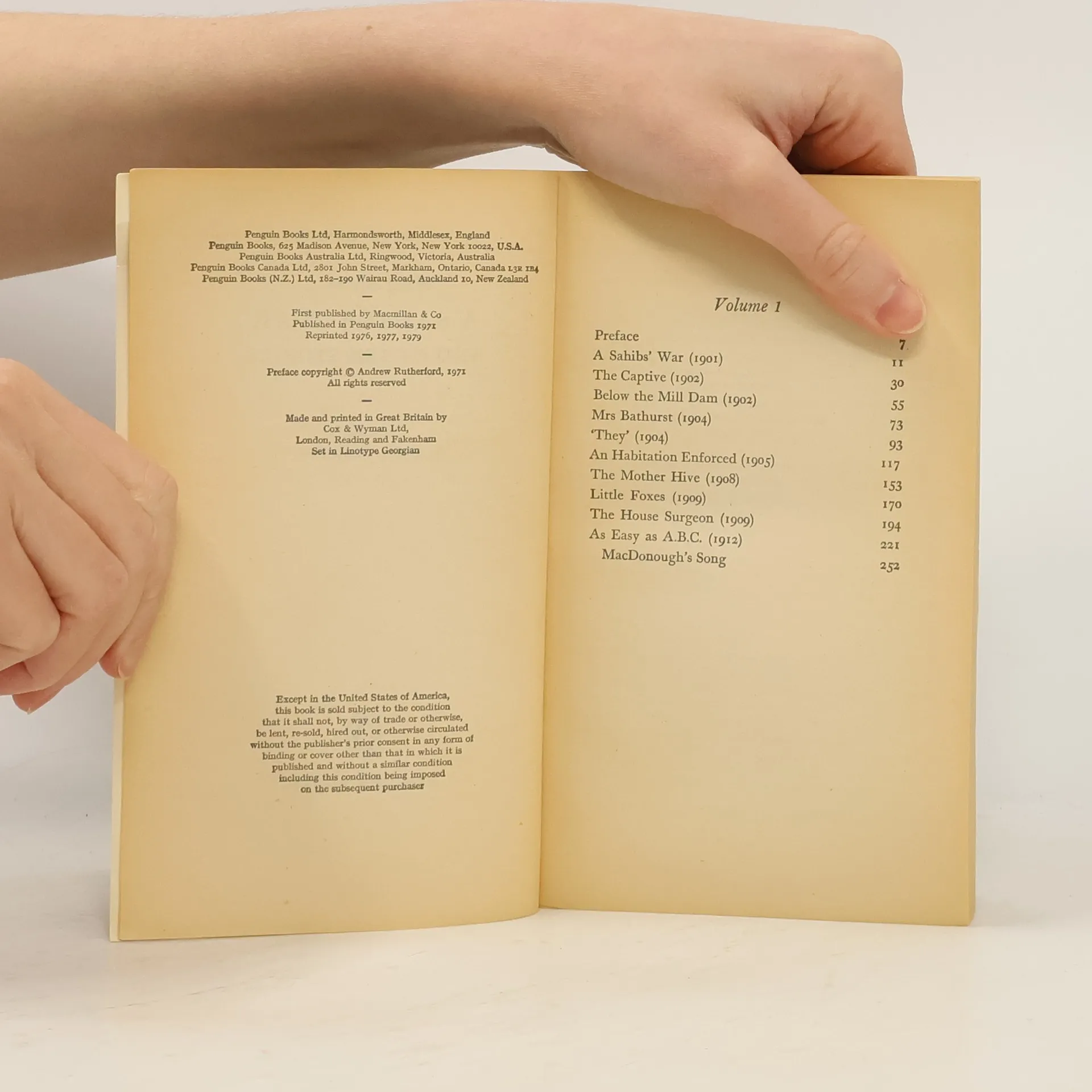 Of the two volumes, A Sahib's War and Other Stories and Friendly Brook and Other Stories, Professor Rutherford, who selected the contents of both volumes, writes: 'There are fewer tales of Empire than the popular stereotype of Kipling might lead readers to expect....Increasingly he was preoccupied by the condition of England herself, as he rebuked her blindness, folly and complacency, and sought reassurance in groups, types, or individuals who might still redeem her backslidings.