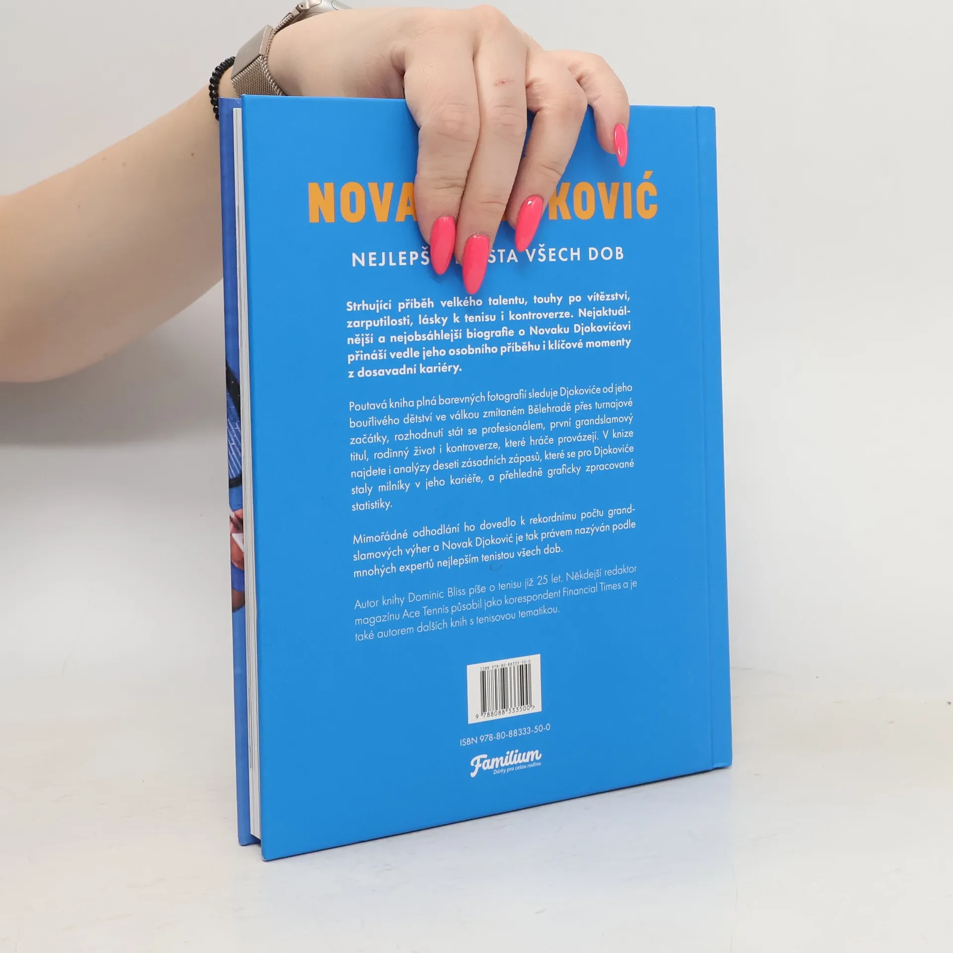 Strhující příběh velkého talentu, touhy po vítězství, zarputilosti, lásky k tenisu i kontroverze. Nejaktuálnější a nejobsáhlejší biografie o Novaku Djokovićovi přináší vedle jeho osobního příběhu i klíčové momenty z dosavadní kariéry. Poutavá kniha plná barevných fotografií sleduje Djokoviće od jeho bouřlivého dětství ve válkou zmítaném Bělehradě přes turnajové začátky, rozhodnutí stát se profesionálem, první grandslamový titul, rodinný život i kontroverze, které hráče provázejí. V knize najdete i analýzy deseti zásadních zápasů, které se pro Djokoviće staly milníky v jeho kariéře, a přehledně graficky zpracované statistiky. Mimořádné odhodlání ho dovedlo k rekordnímu počtu grandslamových výher a Novak Djoković je tak právem nazýván podle mnohých expertů nejlepším tenistou všech dob. Autor knihy Dominic Bliss píše o tenisu již 25 let. Někdejší redaktor magazínu Ace Tennis působil jako korespondent Financial Times a je také autorem dalších knih s tenisovou tematikou.