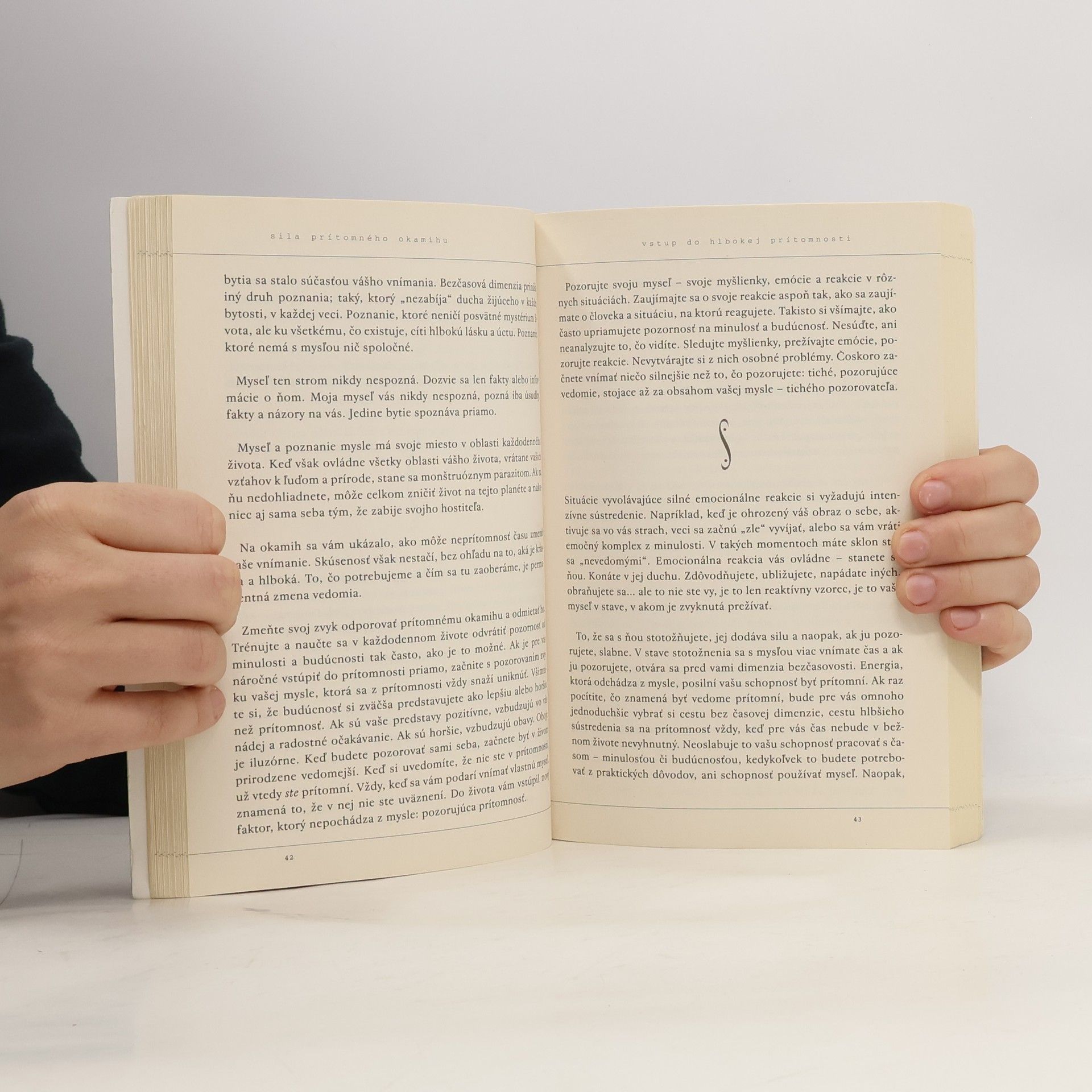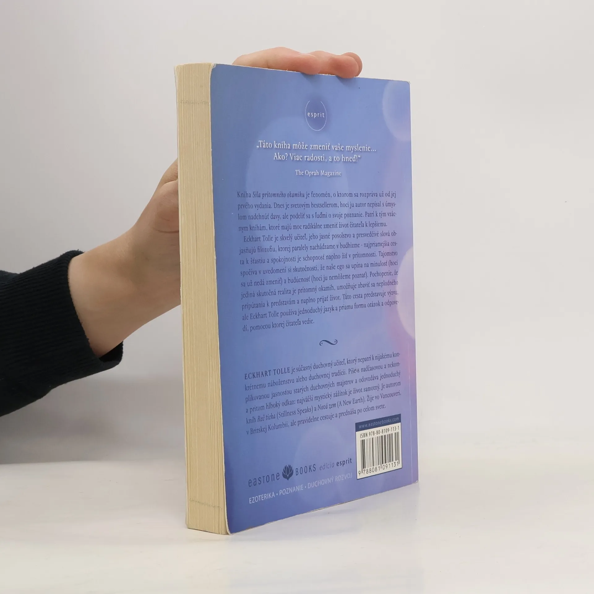 Sprievodca na ceste k duchovnému rastu. Kniha Sila prítomného okamihu je fenomén, o ktorom sa rozpráva už od jej prvého vydania. Dnes je svetovým bestsellerom, hoci ju autor nepísal s úmyslom nadchnúť davy, ale podeliť sa s ľuďmi o svoje poznanie. Patrí k vzácnym knihám, ktoré majú moc radikálne zmeniť život čitateľa k lepšiemu. Eckhart Tolle je súčasný duchovný učiteľ, ktorý sa neprikláňa k nijakému konkrétnemu náboženstvu alebo duchovnej tradícii. Píše s nadčasovou a nekomplikovanou jasnosťou starých duchovných majstrov a odovzdáva jednoduchý a pritom hlboký odkaz: Najpriamejšia cesta ku šťastiu a spokojnosti je schopnosť naplno žiť v prítomnosti. Jeho jasné posolstvo a presvedčivé slová objasňujú filozofiu, ktorej paralely nachádzame v budhizme. Tajomstvo spočíva v uvedomení si skutočnosti, že naše ego sa upína na minulosť (hoci sa už nedá zmeniť) a budúcnosť (hoci ju nemôžeme poznať). Pochopenie, že jediná skutočná realita je prítomný okamih, umožňuje zbaviť sa neplodného pripútania k predstavám a naplno prijať život.