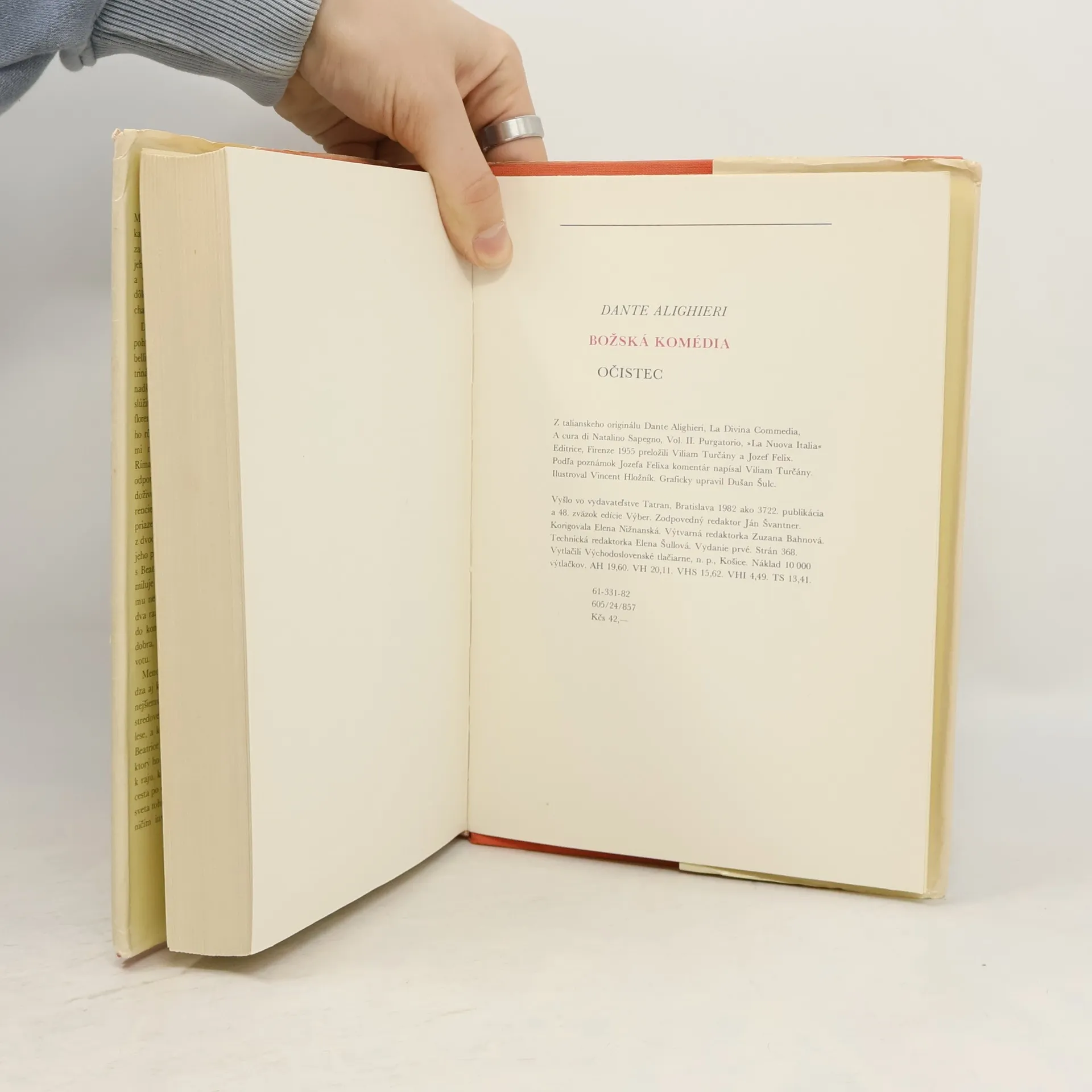 Kniha je druhou časťou slávnej a legendárnej La Divina Comedia. Dante a jeho sprievodca Vergílius pokračujú vo svojom putovaní za stratenou láskou Beatrice. Ich cesty vedú z pekla, po prelezení skrze diabla, ktorý naveky požiera dušu Judášovu, na protipól sveta mystického do očistca. Tu stretávajú duše tých, ktorí neboli na veky zatratení, ale ich duša nebola v stave blaženosti, v čase smrti ich telesnej schránky, ktorá je nutná k priamemu prechodu do bázne nebeskej a blízkosti Boha trojjedinného. Prvé vydanie. Komentár podľa poznámok J. Felixa napísal Viliam Turčány.