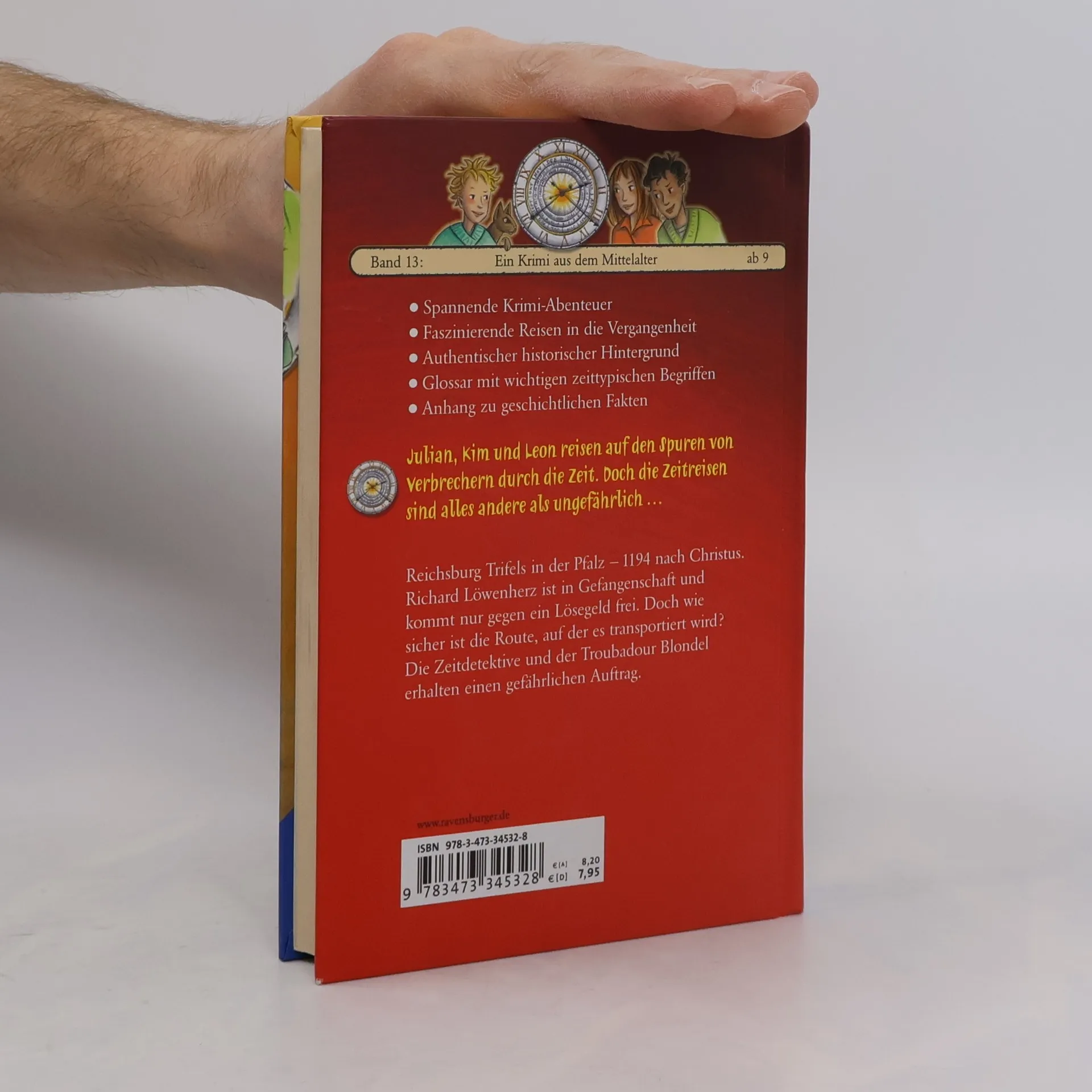 Julian, Kim und Leon reisen auf den Spuren von Verbrechern durch die Zeit. Doch die Zeitreisen sind alles andere als ungefährlich...Reichsburg Trifels in der Pfalz – 1194 nach Christus. Richard Löwenherz ist in Gefangenschaft und kommt nur gegen ein Lösegeld frei. Doch wie sicher ist die Route, auf der es transportiert wird? Die Zeitdetektive und der Troubadour Blondel erhalten einen gefährlichen Auftrag.Die Zeitdetektive erleben spannende Krimi-Abenteuer und faszinierende Reisen in die Vergangenheit in einem authentischen historischen Hintergrund.