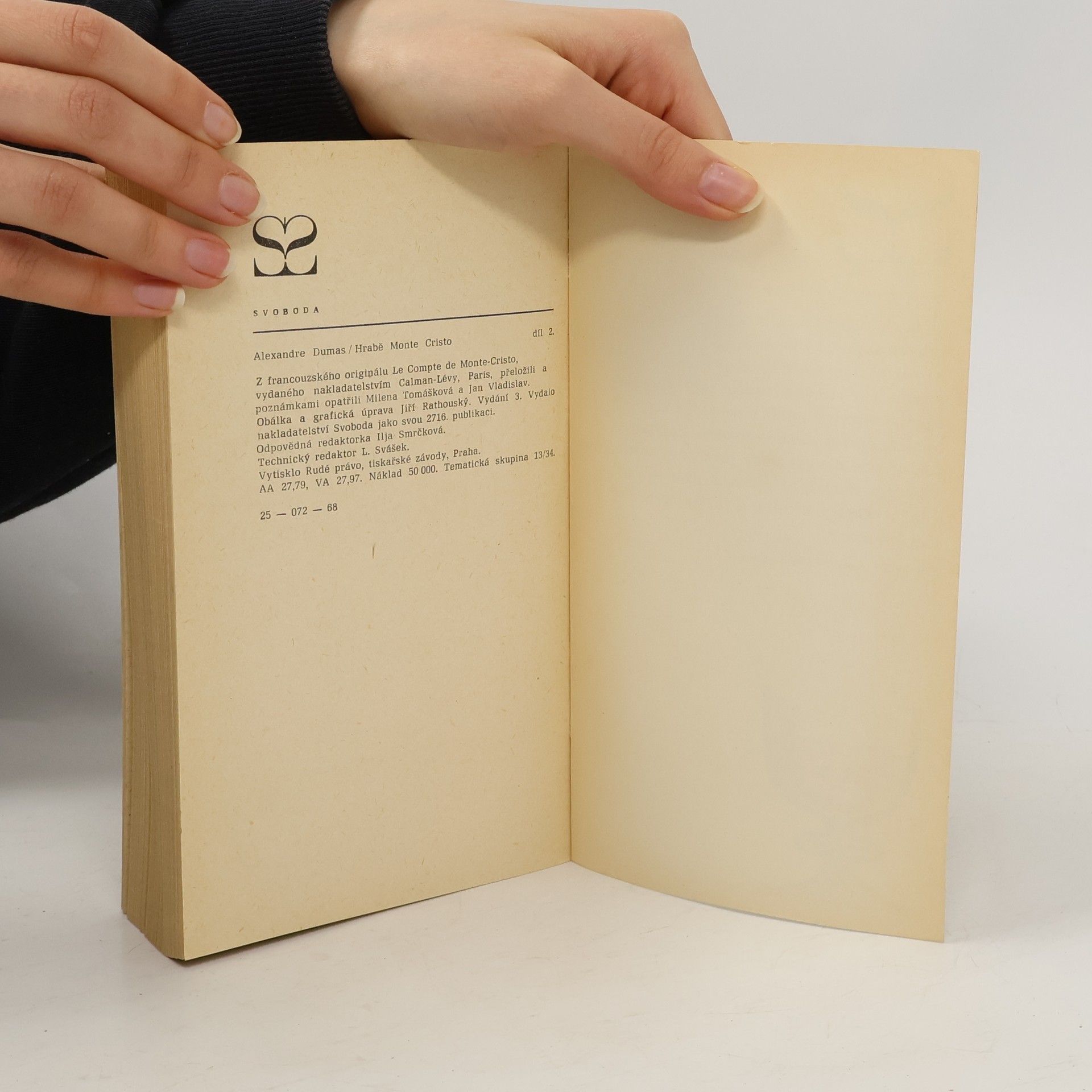 Edmond Dantès strávil ve vězení bez soudu dvacet let. Podaří se mu však uprchnout a po nálezu tajemného pokladu, o kterém mu řekl jeho bývalý spoluvězeň abbé Faria, se z něho stává boháč. Nechá si říkat Hrabě Monte-Christo a rozhodne se využít svého bohatství pro osobní mstu za spáchané křivdy. Nalezne své nepřátele ve velmi významných postaveních. Z Danglarse je bohatý bankéř, z Mondega (který se oženil s Mercedes) uznávaný generál hrabě de Morcerf a z Villeforta úspěšný prokurátor. Edmond Dantès je však postupně všechny zničí. Prvním na řadě je Danglars, kterého Dantès obratnou manipulací přivede k bankrotu. Pak se postará o zveřejnění Villefortova tajemství, kterým je odložení jeho nemanželského syna, z nějž vyrostl bezskrupulózní zloděj a vrah. Poslední zaplatí Mondego, když Dantès odhalí jeho hanebný zločin vojenské zrady a Fernand po odsouzení veřejností i vlastní rodinou spáchá sebevraždu. Dantès se smiluje jen nad Mondegovým synem Albertem, protože jej o jeho život přišla požádata sama Mercedes. Jejich láska je však již navždy ztracena a Dantès odplouvá začít nový život s mladou otrokyní Haydée. Souborné vydání Hrabě Monte Cristo, z technických důvodů vyšlo ve dvou svazcích. I. díl první až třetí. 664 s. -- II. díl čtvrtý až šestý. 633 s.