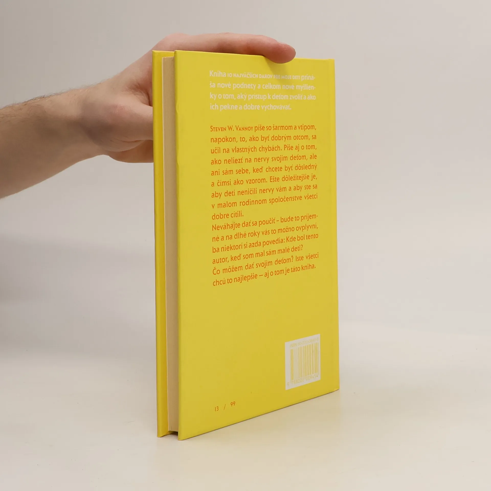 Stewen W. Vannoy píše so šarmom a vtipom, napokon, to, ako byť dobrým otcom, sa učil na vlastných chybách. Píše o tom, ako neliezť na nervy svojim deťom, ale ani sám sebe, keď chcete byť dôsledný a čímsi ako vzorom. Ešte dôležitejšie je, aby deti neničili nervy vám a by ste sa v malom rodinnom spoločenstve všetci dobre cítili. Neváhajte dať sa poučiť - bude to príjemné a na dlhé roky vás to možno ovplyvní, ba niektorí si azda povedia: Kde bol tento autor, keď som mal sám malé deti? Čo môžem dať svojim deťom? Iste všetci chcú to najlepšie - aj o tom je táto kniha.