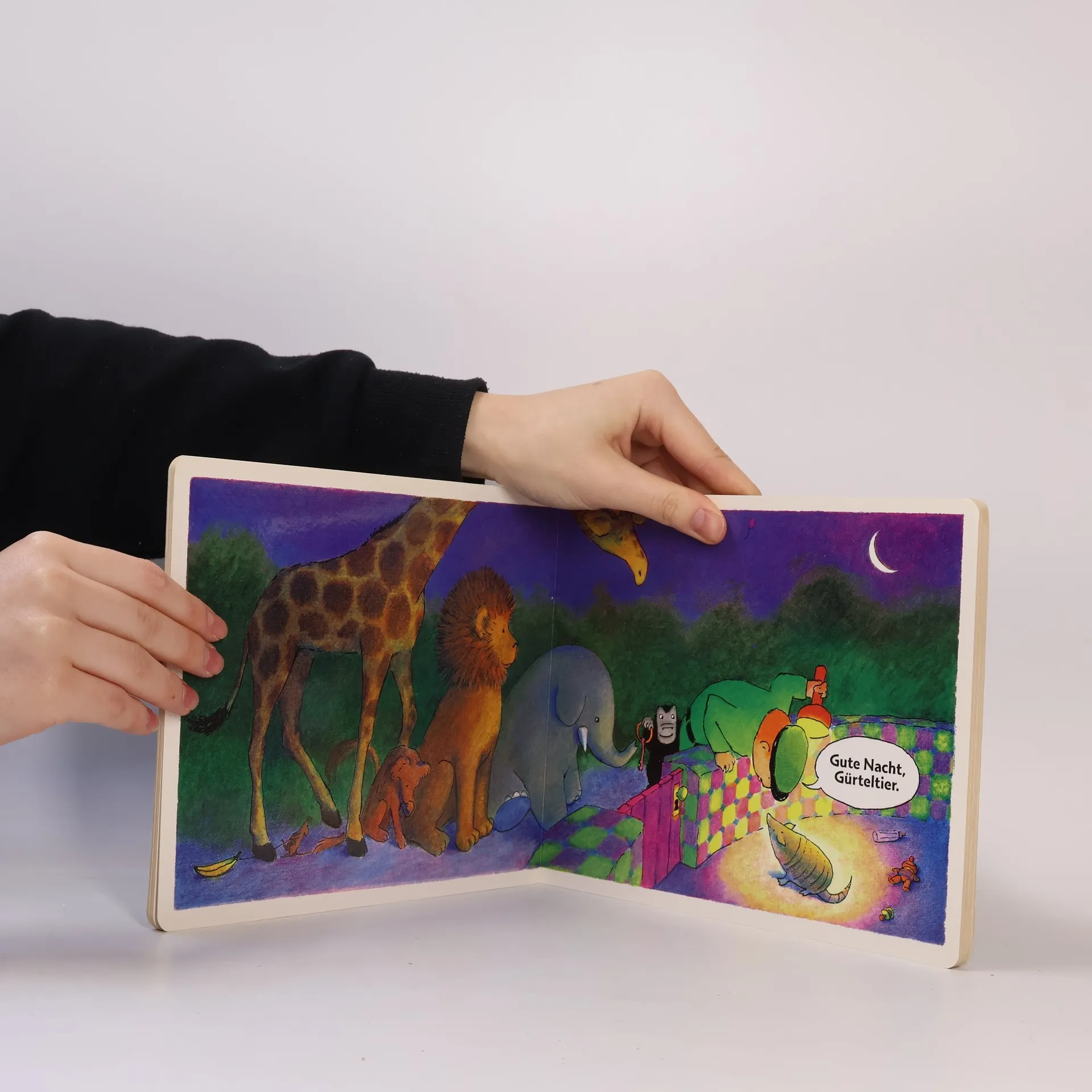Der kleine Gorilla stibitzt dem Zoowärter den Schlüssel! Und nun folgen die Zootiere ihrem Wärter bis ins Schlafzimmer. Ein Bilderbuchschatz in Pappe! Gute Nacht, Gorilla! ist ein großartiges Bilderbuch für die Kleinsten! Es ist prächtig nachzuvollziehen, wie der kleine Gorilla dem Zoowärter den Schlüssel entwendet und dann die Tiere des Zoos, vom Elefant bis zum Gürteltier, dem müden Wärter bis ins Schlafzimmer folgen. Und wenn nicht alle dessen Frau so höflich auf ihr »Gute Nacht, Liebling« geantwortet hätten, hätten sie dort wohl auch bleiben können ... Dieser Bilderbuchriesenerfolg aus den USA erscheint als Pappbilderbuch jetzt auch bei uns.