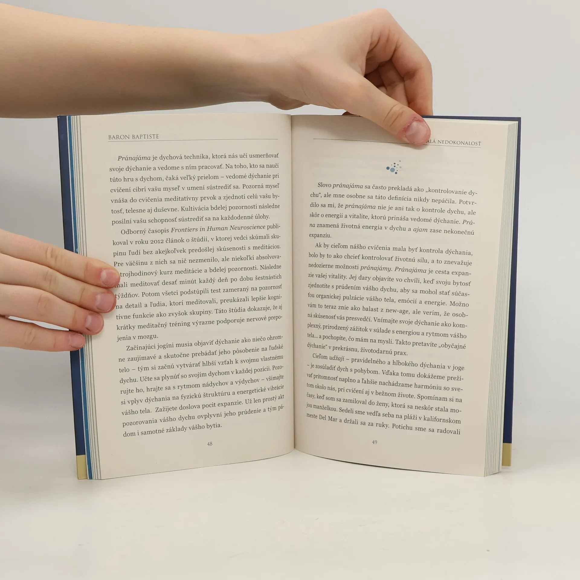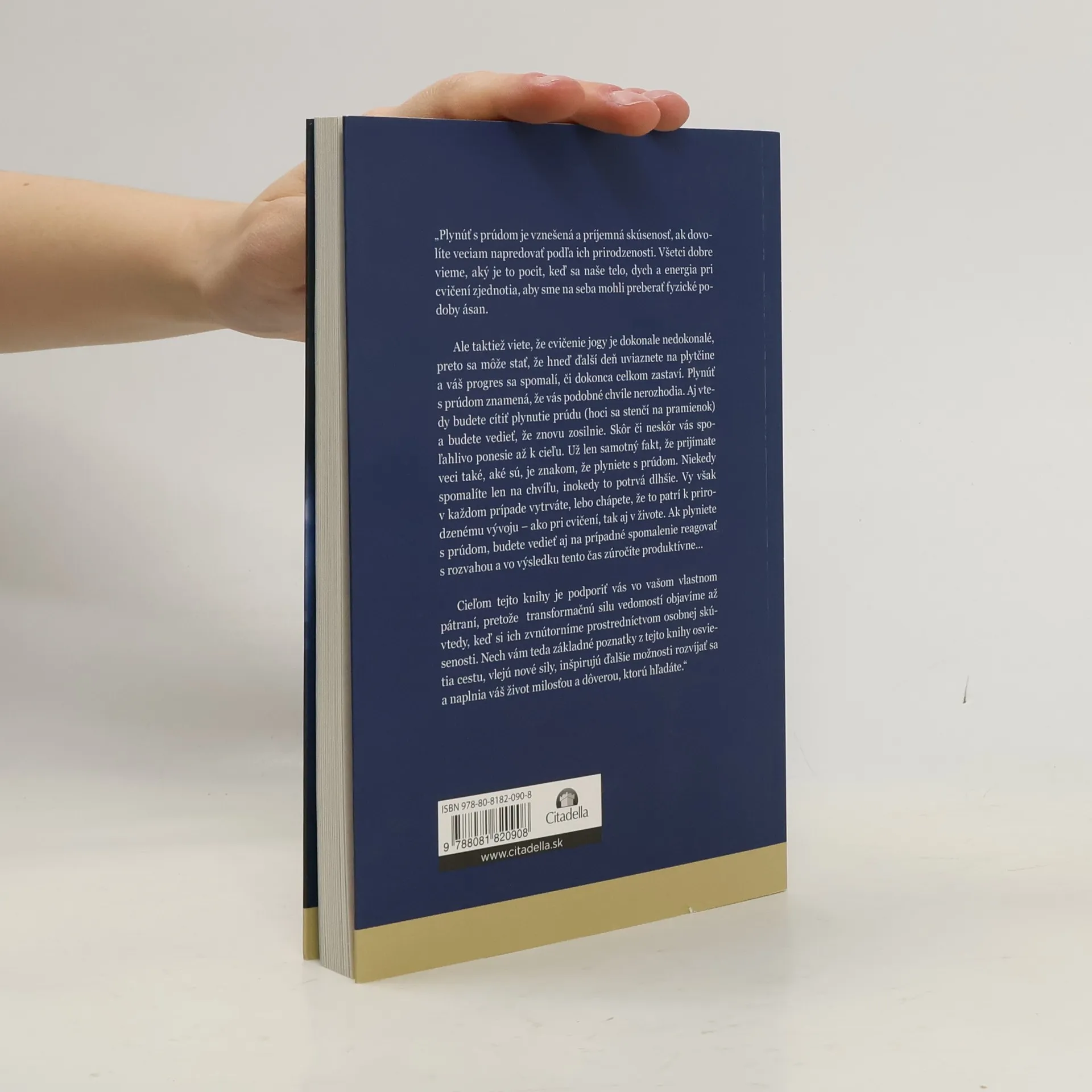 „Plynúť s prúdom je vznešená a príjemná skúsenosť, ak dovolíte veciam napredovať podľa ich prirodzenosti. Všetci dobre vieme, aký je to pocit, keď sa naše telo, dych a energia pri cvičení zjednotia, aby sme na seba mohli preberať fyzické podoby ásan. Ale taktiež viete, že cvičenie jogy je dokonale nedokonalé, preto sa môže stať, že hneď ďalší deň uviaznete na plytčine a váš progres sa spomalí, či dokonca celkom zastaví. Plynúť s prúdom znamená, že vás podobné chvíle nerozhodia. Aj vtedy budete cítiť plynutie prúdu (hoci sa stenčí na pramienok) a budete vedieť, že znovu zosilnie. Skôr či neskôr vás spoľahlivo ponesie až k cieľu. Už len samotný fakt, že prijímate veci také, aké sú, je znakom, že plyniete s prúdom. Niekedy spomalíte len na chvíľu, inokedy to potrvá dlhšie. Vy však v každom prípade vytrváte, lebo chápete, že to patrí k prirodzenému vývoju – ako pri cvičení, tak aj v živote. Ak plyniete s prúdom, budete vedieť aj na prípadné spomalenie reagovať s rozvahou a vo výsledku tento čas zúročíte produktívne… Cieľom tejto knihy je podporiť vás vo vašom vlastnom pátraní, pretože transformačnú silu vedomostí objavíme až vtedy, keď si ich zvnútorníme prostredníctvom osobnej skúsenosti. Nech vám teda základné poznatky z tejto knihy osvietia cestu, vlejú nové sily, inšpirujú ďalšie možnosti rozvíjať sa a naplnia váš život milosťou a dôverou, ktorú hľadáte.“