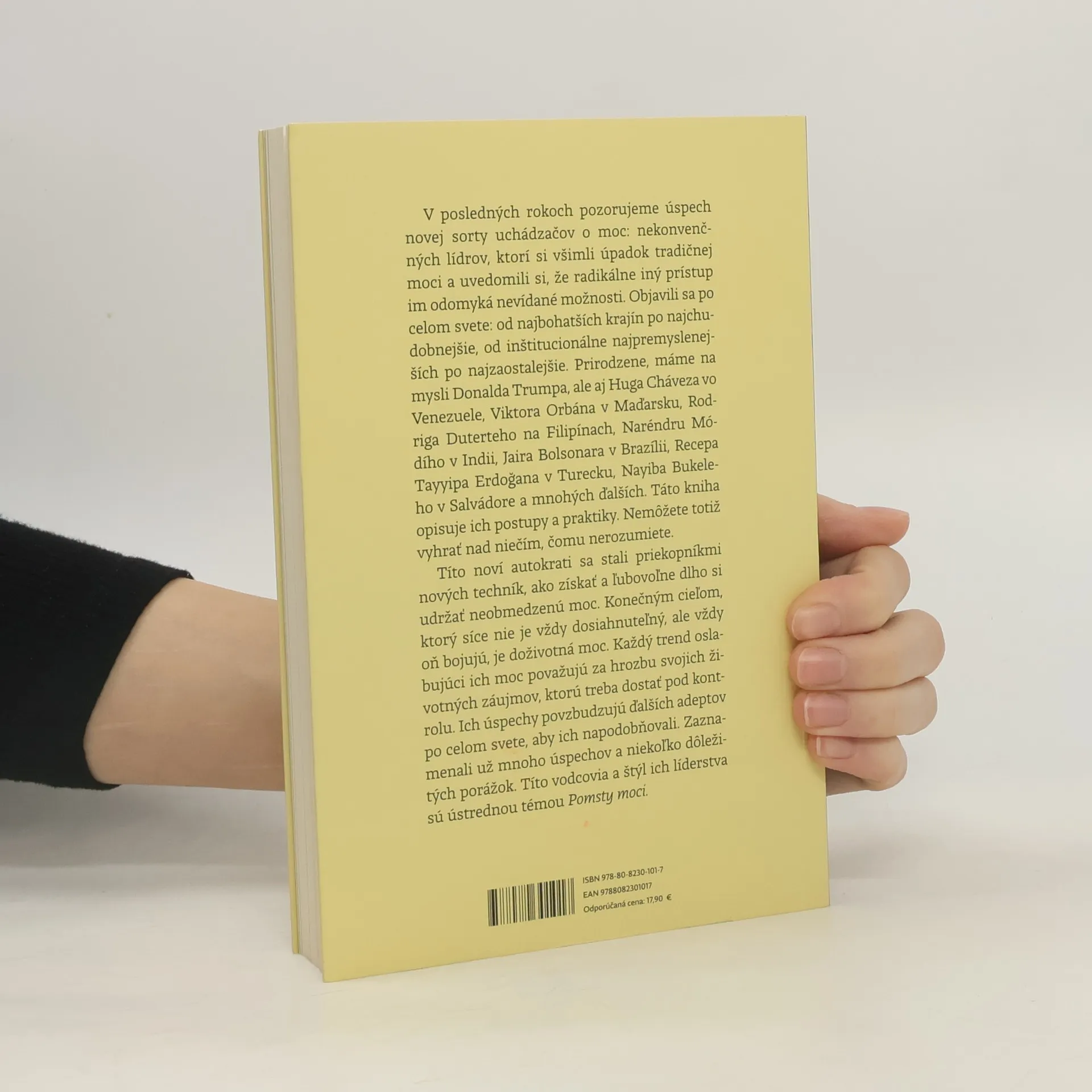 Nevšedný a napínavý príbeh o budúcnosti demokracie, ktorý objasňuje zápas o budúcnosť slobody a porážku autokratických režimov. Ekonóm a bývalý politik Moisés Naím prináša naliehavý pohľad na to, ako zachovať demokraciu a slobodu v čase, keď autokrati narastajú v mnohých krajinách. V knihe sa analyzujú politické trendy, technológie a správanie, ktoré vedú k koncentrácii moci a politickým rozporom, pričom sa sústreďuje na tri P – populizmus, polarizáciu a postpravdivosť. Tieto nástroje, hoci historicky známe, sú dnes kombinované novými a desivejšími spôsobmi, čo podkopáva demokratické zásady. Aspirovaní autokrati majú prístup k novým možnostiam a technológiam, ktoré im umožňujú usilovať o neobmedzenú moc. Kniha obsahuje kontroverzné postavy a fascinujúce príbehy o moci, ako aj príklady taktík proti autoritárskej moci. Naím odhaľuje opakujúce sa vzorce stratégií na upevnenie moci v rôznych politických a sociálnych kontextoch a zamýšľa nad tým, čo môžeme urobiť pre obnovenie slobody a demokracie. Výsledky boja o moc určia, či sa budúcnosť vyvinie demokraticky alebo autokraticky.
