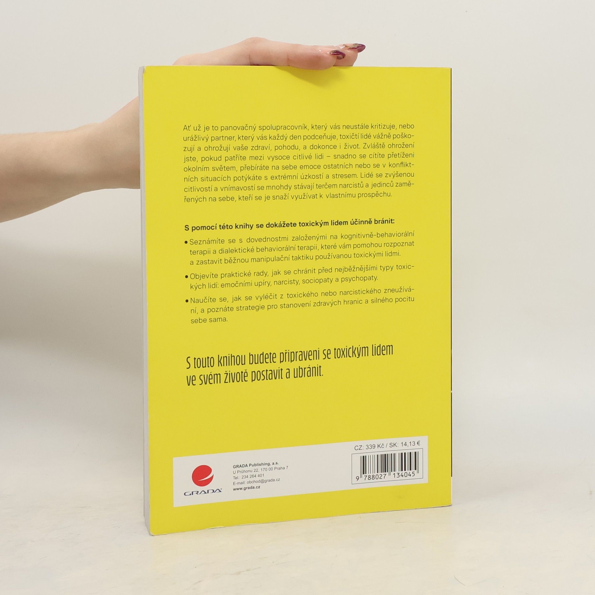 Ať už je to panovačný spolupracovník, který vás neustále kritizuje, nebo urážlivý partner, který vás každý den podceňuje, toxičtí lidé vážně poškozují a ohrožují vaše zdraví, pohodu, a dokonce i život. Zvláště ohrožení jste, pokud patříte mezi vysoce citlivé lidi – snadno se cítíte přetíženi okolním světem, přebíráte na sebe emoce ostatních nebo se v konfliktních situacích potýkáte s extrémní úzkostí a stresem. Lidé se zvýšenou citlivostí a vnímavostí se mnohdy stávají terčem narcistů a jedinců zaměřených na sebe, kteří se je snaží využívat k vlastnímu prospěchu. S pomocí této knihy se dokážete toxickým lidem účinně bránit: Seznámíte se s dovednostmi založenými na kognitivně-behaviorální terapii a dialektické behaviorální terapii, které vám pomohou rozpoznat a zastavit běžnou manipulační taktiku používanou toxickými lidmi. Objevíte praktické rady, jak se chránit před nejběžnějšími typy toxických lidí: emočními upíry, narcisty, sociopaty a psychopaty. Naučíte se, jak se vyléčit z toxického nebo narcistického zneužívání, a poznáte strategie pro stanovení zdravých hranic a silného pocitu sebe sama.