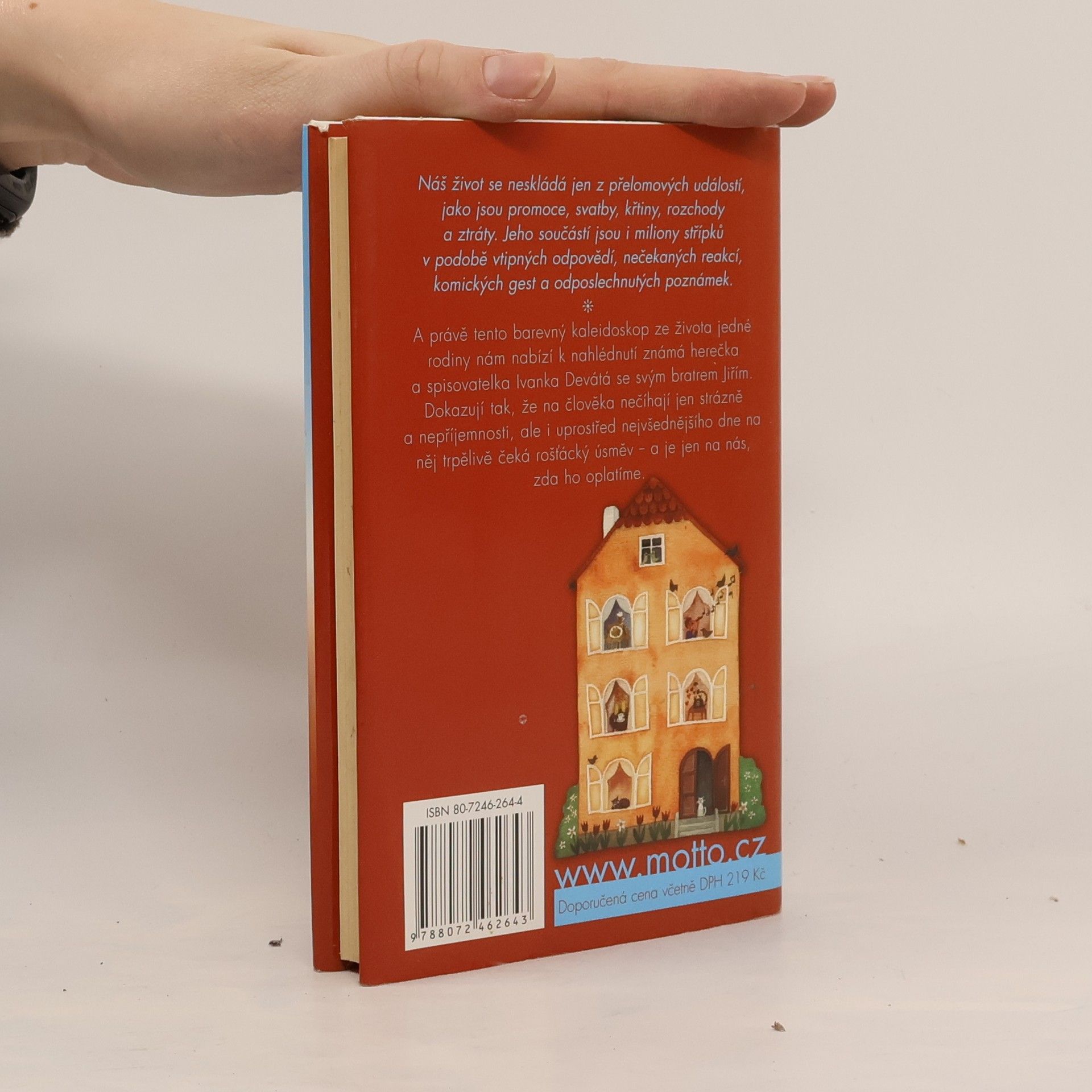 Náš život se neskládá jen z přelomových událostí, jako jsou promoce, svatby, křtiny, rozchody a ztráty. Jeho součástí jsou i miliony střípků v podobě vtipných odpovědí, nečekaných reakcí, komických gest a odposlechnutých poznámek. A právě tento barevný kaleidoskop ze života jedné rodiny nám nabízí k nahlédnutí známá herečka a spisovatelka Ivanka Devátá se svým bratrem Jiřím. Dokazují tak, že na člověka nečíhají jen strázně a nepříjemnosti, ale na něj i uprostřed nejvšednějšího dne trpělivě čeká rošťácký úsměv – a je jen na nás, zda ho oplatíme.