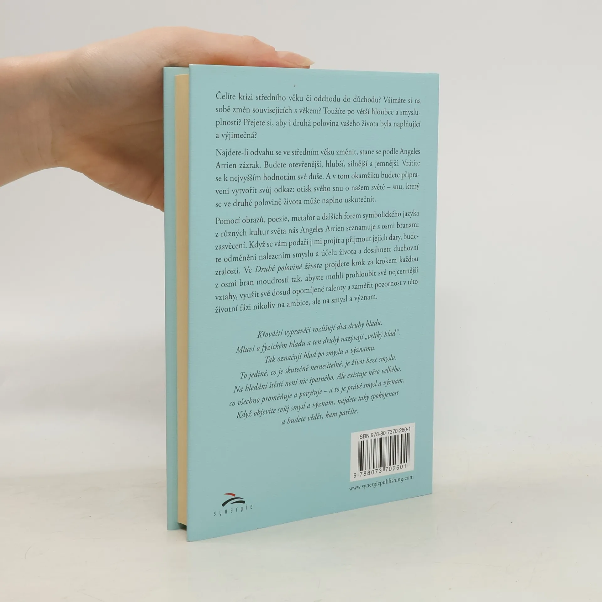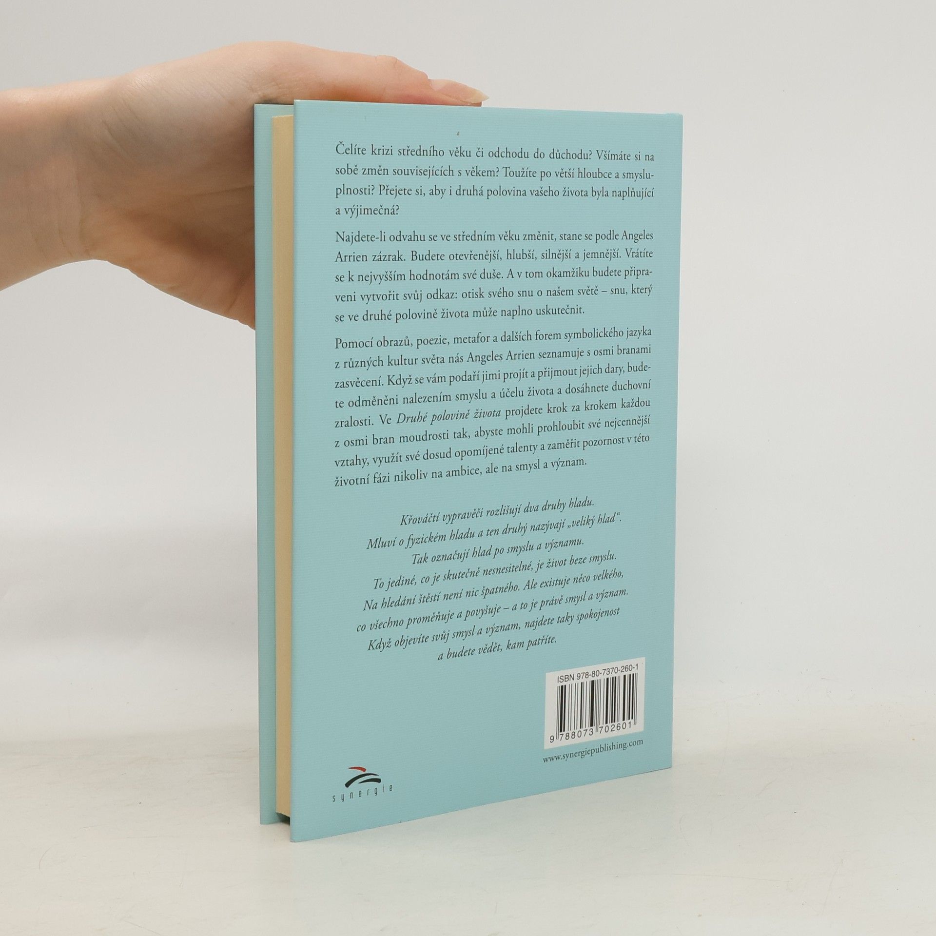 Čelíte krizi středního věku či odchodu do důchodu? Všímáte si na sobě změn souvisejících s věkem? Toužíte po větší hloubce a smysluplnosti? Přejete si, aby i druhá polovina vašeho života byla naplňující a výjimečná? Najdete-li odvahu se ve středním věku změnit, stane se podle Angeles Arrien zázrak. Budete otevřenější, hlubší, silnější a jemnější. Vrátíte se k nejvyšším hodnotám své duše. A v tom okamžiku budete připraveni vytvořit svůj odkaz: otisk svého snu o našem světě – snu, který se ve druhé polovině života může naplno uskutečnit. Pomocí obrazů, poezie, metafor a dalších forem symbolického jazyka z různých kultur světa nás Angeles Arrien seznamuje s osmi branami zasvěcení. Když se vám podaří jimi projít a přijmout jejich dary, budete odměněni nalezením smyslu a účelu života a dosáhnete duchovní zralosti. Ve Druhé polovině života projdete krok za krokem každou z osmi bran moudrosti tak, abyste mohli prohloubit své nejcennější vztahy, využít své dosud opomíjené talenty a zaměřit pozornost v této životní fázi nikoliv na ambice, ale na smysl a význam.