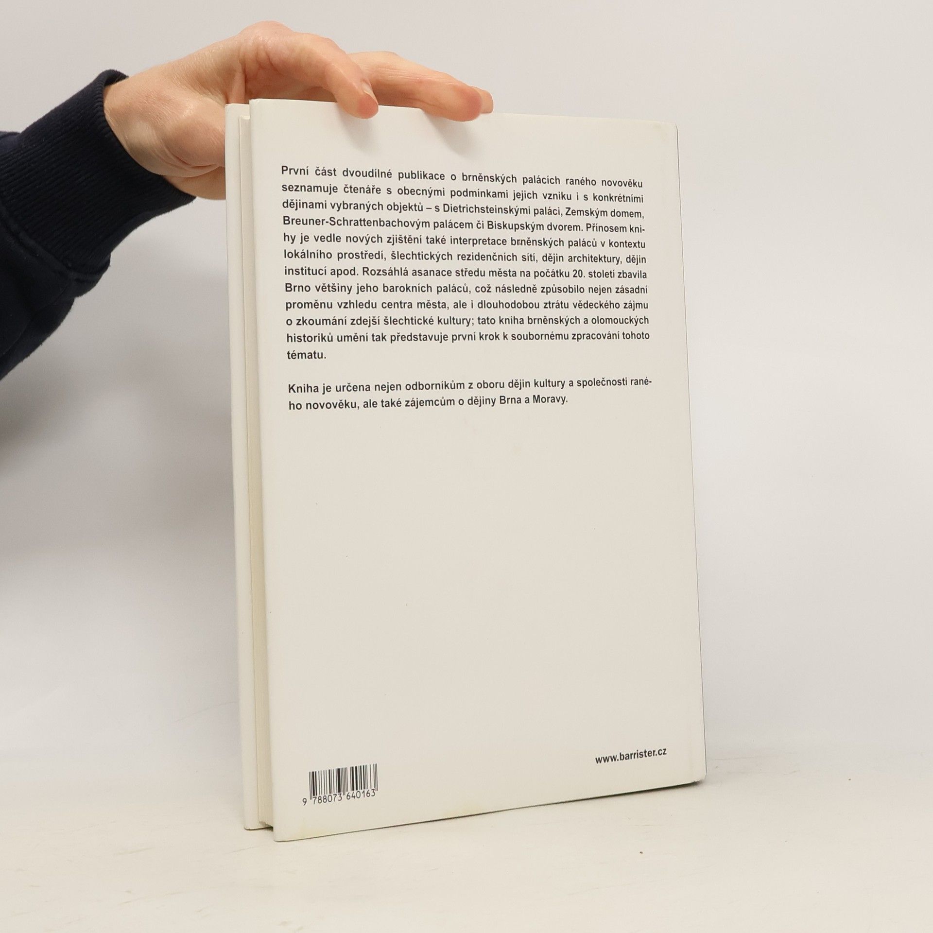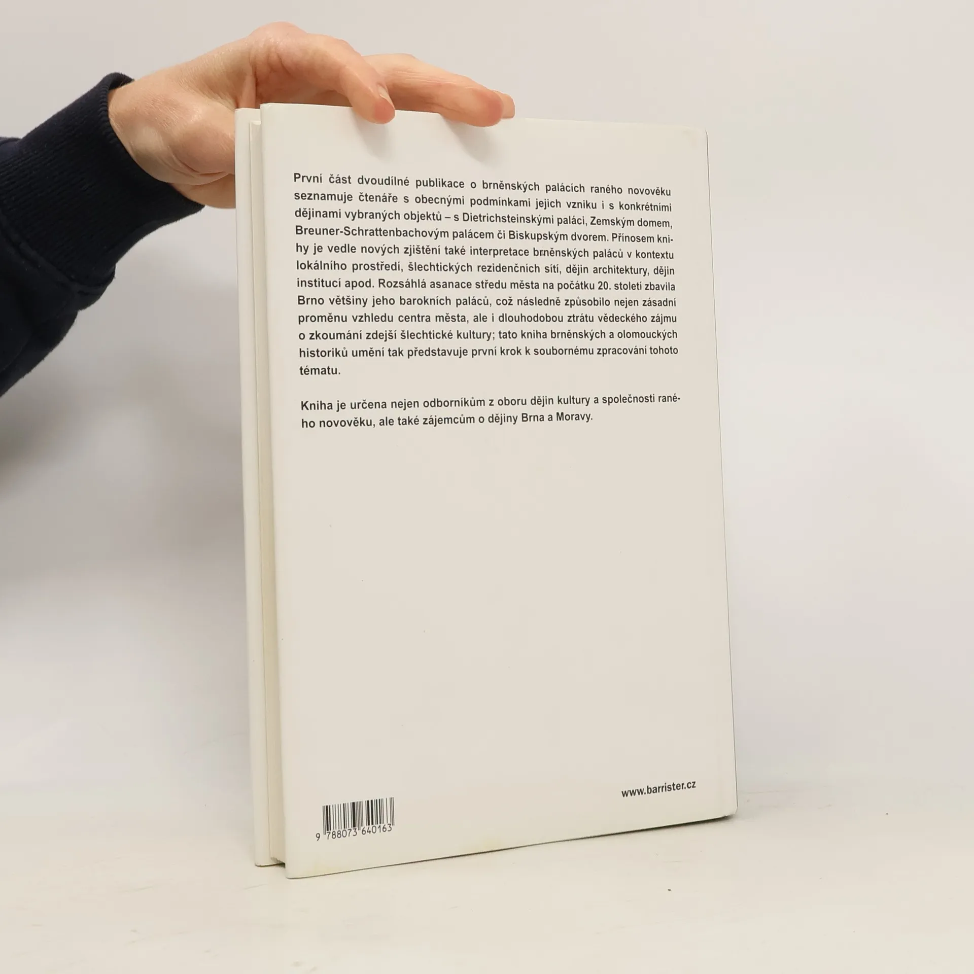 První díl dvousvazkové práce věnované brněnským raně novověkým palácům. Kniha shrnuje desetileté studie brněnských a olomouckých historiků a historiků umění. Kniha nabízí nejen pohled do historie těchto význačných staveb, ale nabízí i obecnější pohled na funkci paláce jako nedílnou součást rezidenční sítě aristokracie.