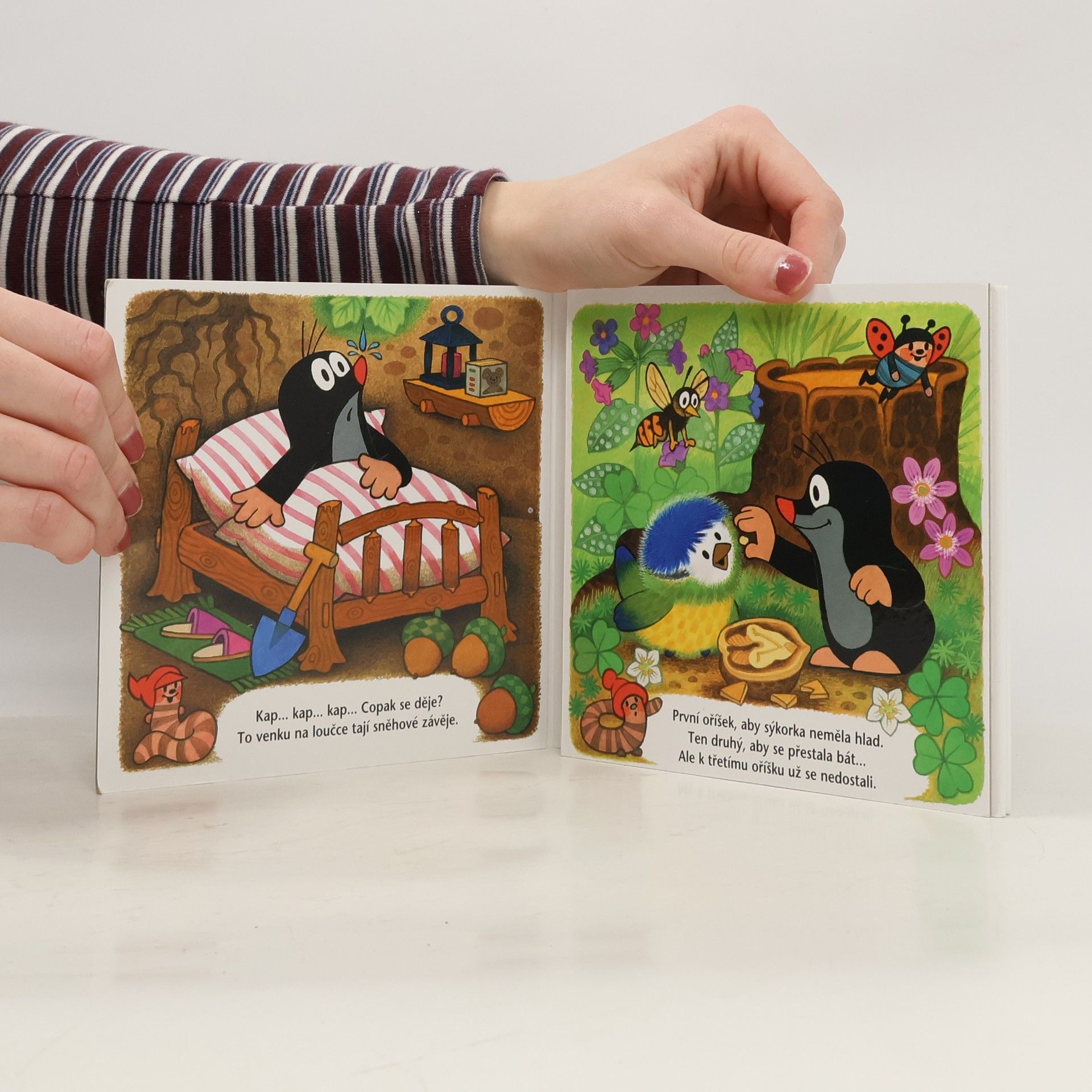O tom, že jaro už je tady, se Krtek přesvědčil, když po zimě vykoukl ze své podzemní světničky. Krtek je rád, že zimu dobře přečkal, a těší se na jarní sluníčko. Ale jak ostatní zimu přežili? Když Krtek zaslechne úpěnlivé pípání malé sýkorky, která vypadla z dutiny stromu, je to úkol pro něj jako stvořený. Ptáčátko utěší, nakrmí, a než zesílí a naučí se lítat, ochrání ho před liškou. Leporelo pro nejmenší.