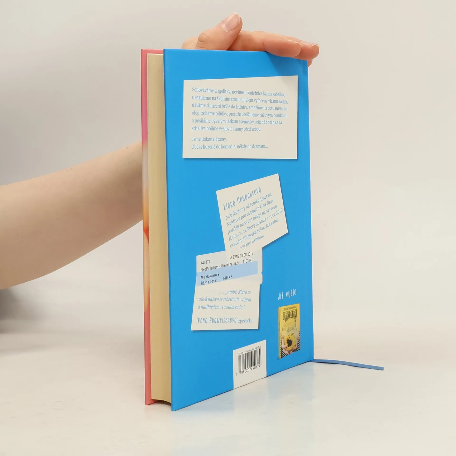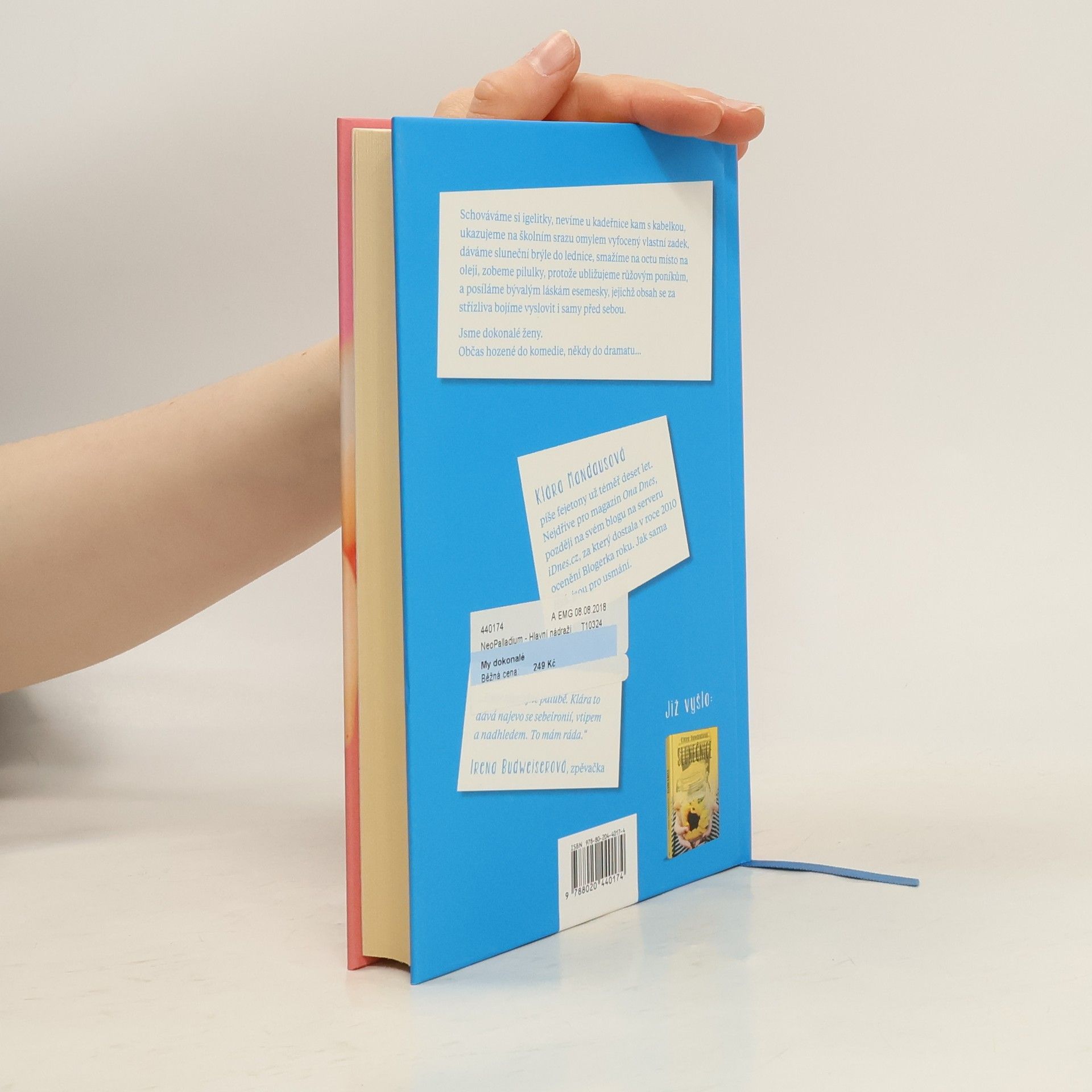 Schováváme si igelitky, nevíme u kadeřnice kam s kabelkou, ukazujeme na školním srazu omylem vyfocený vlastní zadek, dáváme sluneční brýle do lednice, smažíme na octu místo na oleji, zobeme pilulky, protože ubližujeme růžovým poníkům, a posíláme bývalým láskám esemesky, jejichž obsah se za střízliva bojíme vyslovit i samy před sebou. Jsme dokonalé ženy. Občas hozené do komedie, někdy do dramatu… Fejetony píše Klára Mandausová už téměř deset let. Nejdříve pro magazín Ona Dnes, později na svém blogu na serveru iDNES.cz, za který dostala v roce 2010 ocenění Blogerka roku. Jak autorka říká, jsou pro usmání. Je nás málo dokonalých, říká moje teta a já tuhle větu miluju. Mluví sprostě, kouří jako spojené koksovny a je učitelka. Když byly její děti malé, psala mé mamince dopisy s větami „už jsou zase nemocný, počítám, že brzo umřou“.