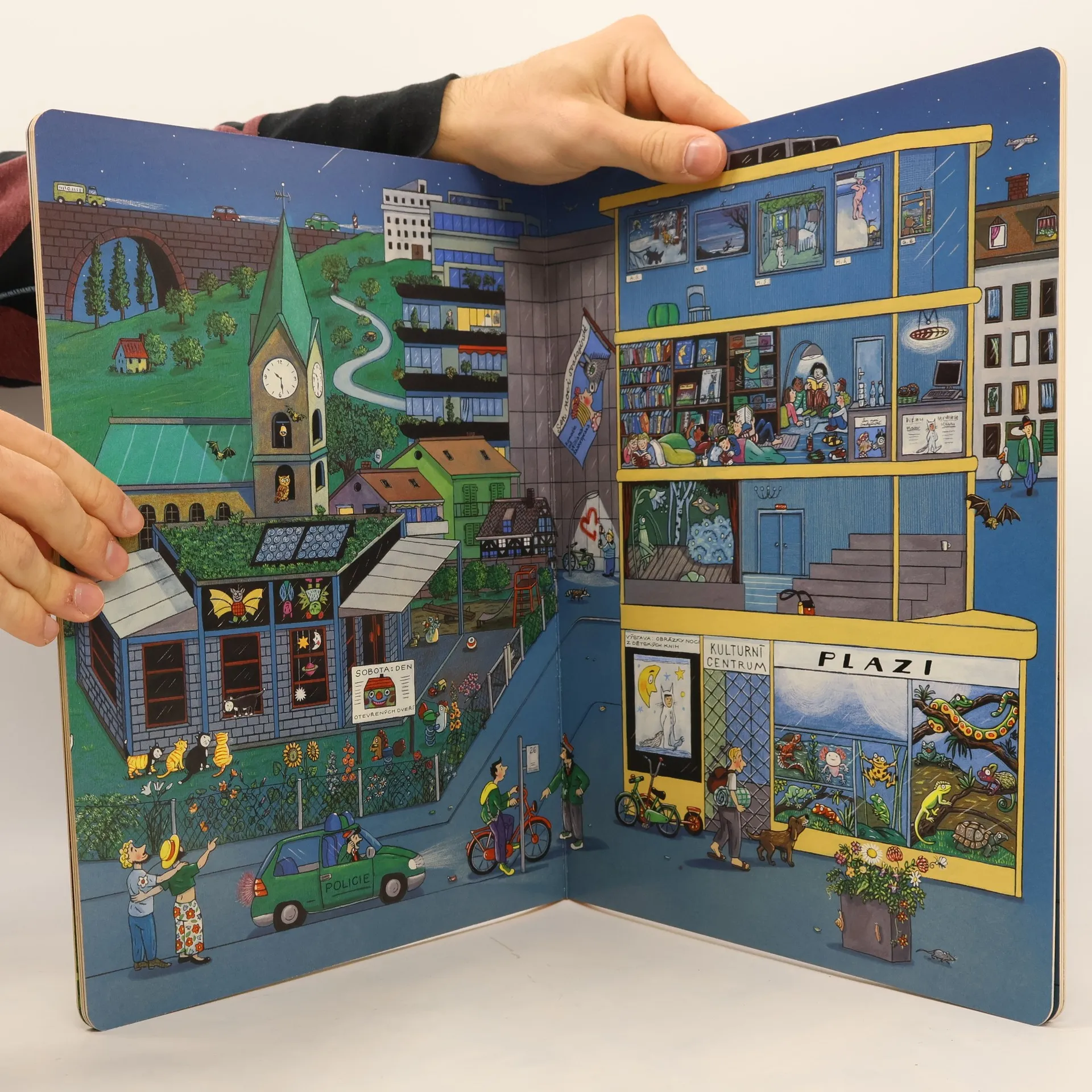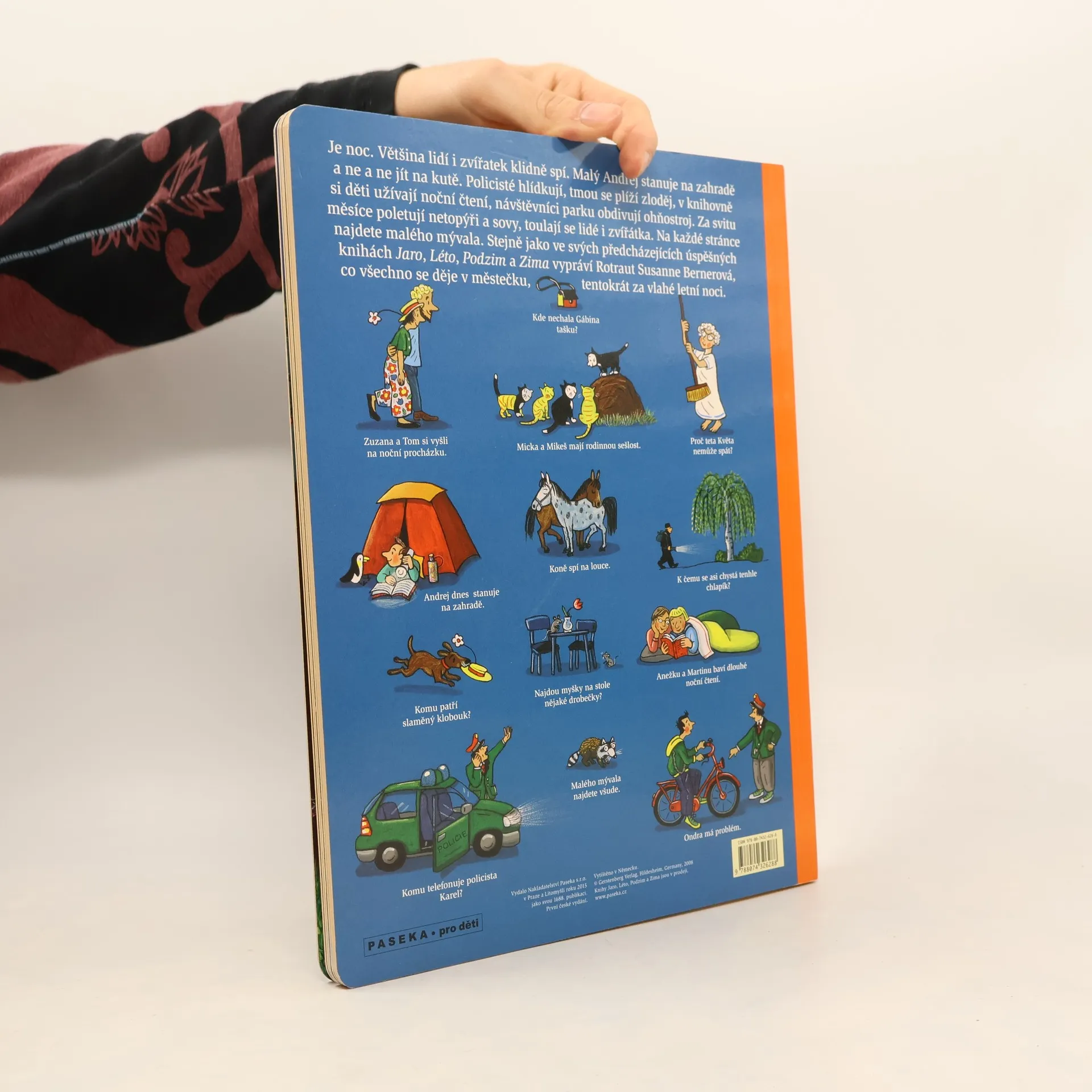 Je noc. Lidé i zvířata klidně spí. Ale ne všichni. Malý Andrej stanuje na zahradě a ne a ne jít na kutě. Policisté hlídkují, v knihovně si děti užívají noční čtení, návštěvníci parku obdivují ohňostroj. Za svitu měsíce poletují netopýři a sovy, toulají se lidé i zvířátka. Na každé stránce najdete malého mývala. A tmou se plíží zloděj… Stejně jako v předcházejících úspěšných knihách Jaro, Léto, Podzim a Zima vypráví Rotraut Susanne Bernerová svými vtipnými obrázky, co všechno se děje v městečku, tentokrát za vlahé letní noci. Knížka podporuje pozorovací schopnosti a podněcuje fantazii, rozvíjí jazyk a rozšiřuje slovní zásobu.