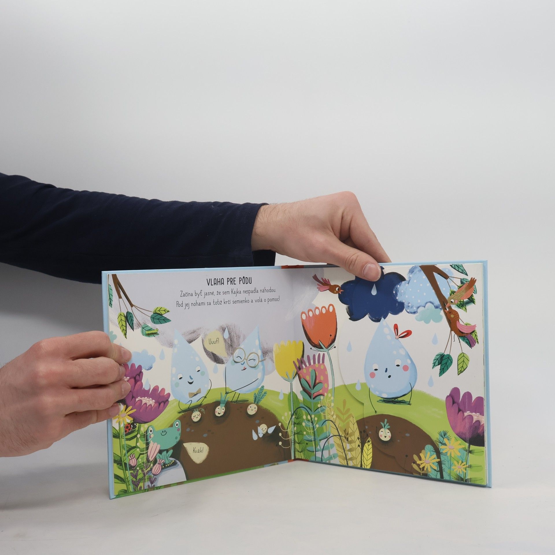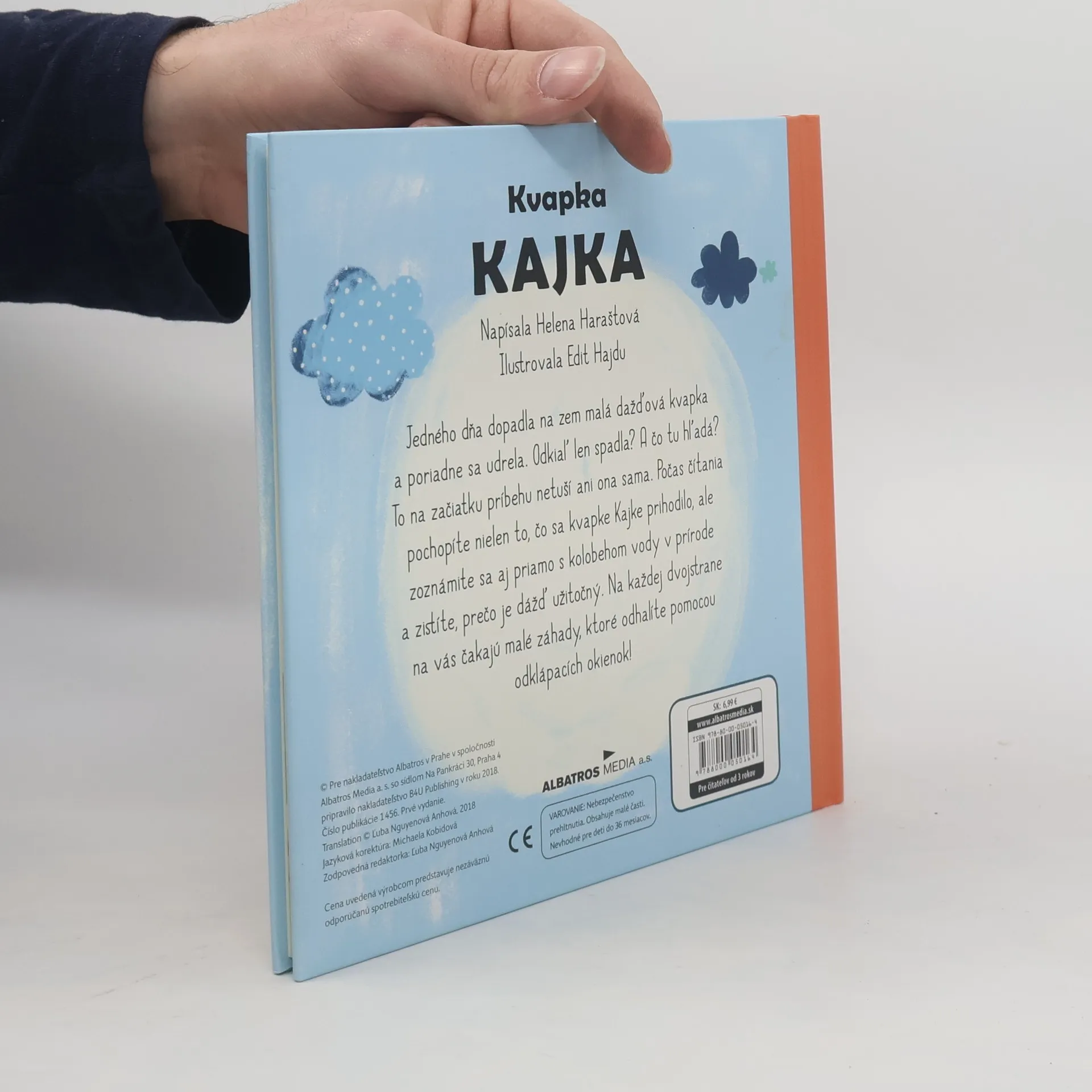 "Naučte sa všetko o vode, daždi aj kvapkách." Jedného dňa dopadla na zem malá dažďová kvapka a poriadne sa udrela. Odkiaľ len spadla? A čo tu hľadá? To na začiatku príbehu netuší ani ona sama. Počas čítania pochopíte nielen to, čo sa kvapke Kajke prihodilo, ale zoznámite sa aj priamo s kolobehom vody v prírode a zistíte, prečo je dážď užitočný. Na každej dvojstrane na vás čakajú malé záhady, ktoré odhalíte pomocou odklápacích okienok!
