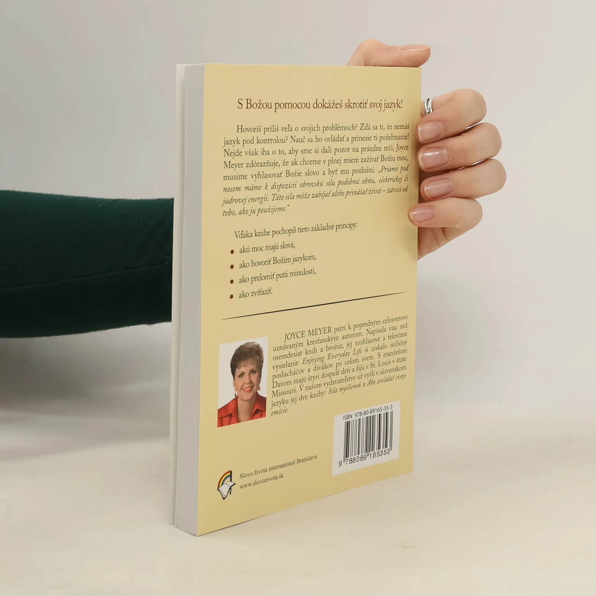 Hovoríš príliš veľa o svojich problémoch? Zdá sa ti, že nemáš jazyk pod kontrolou? Nauč sa ho ovládať a prinesie ti požehnanie! Nejde však iba o to, aby sme si dali pozor na prázdne reči, Joyce Meyer zdôrazňuje, že ak chceme v plnej miere zažívať Božiu moc, musíme vyhlasovať Božie Slovo a byť mu poslušní. „Priamo pod nosom máme k dispozícii obrovskú silu, podobnú ohňu, elektrickej či jadrovej energii. Táto sila môže zabíjať alebo prinášať život – závisí od toho, ako ju použijeme.“ Vďaka knihe pochopíš tieto základné princípy: - akú moc majú slová, ako hovoriť Božím jazykom, ako prelomiť putá minulosti, ako zvíťaziť.