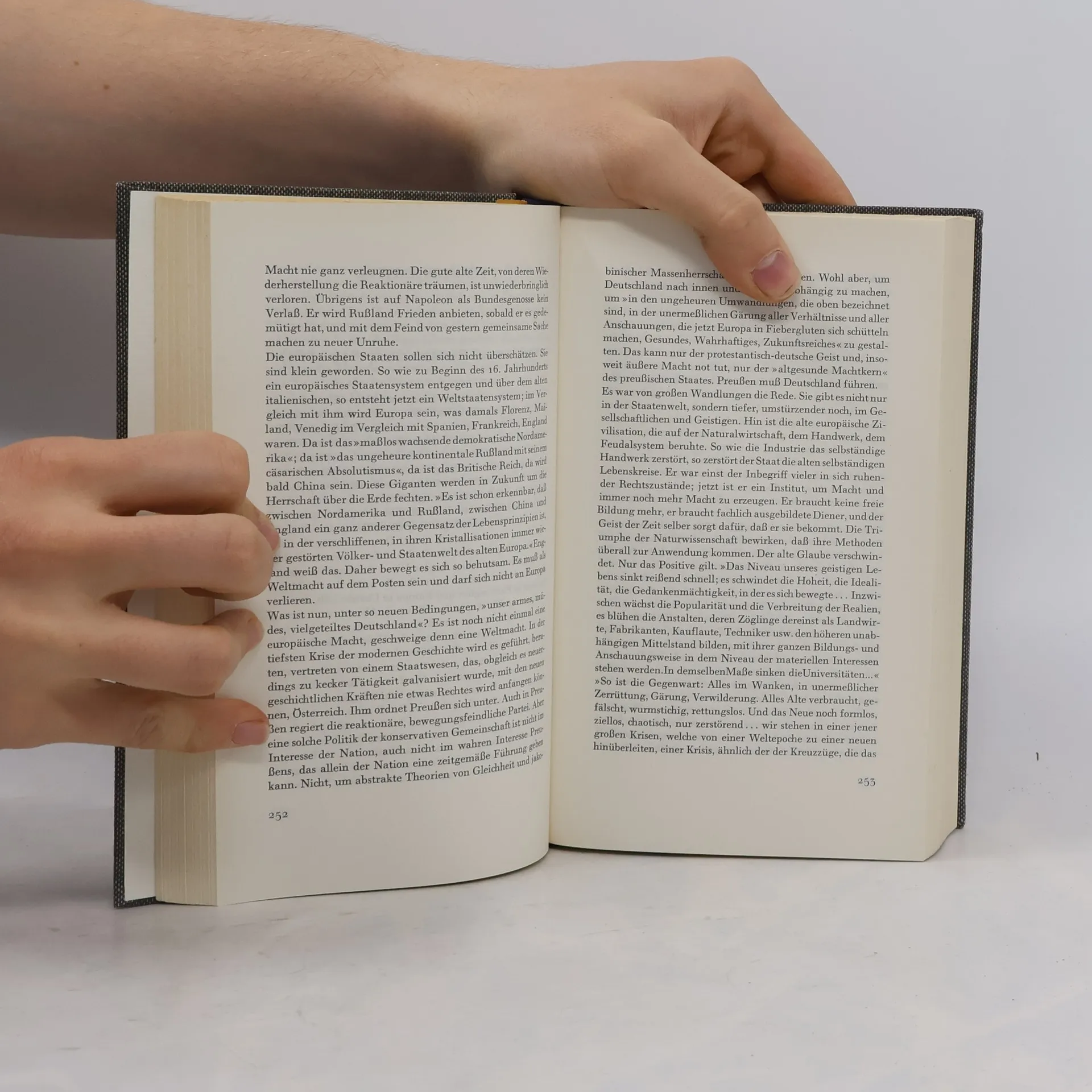 »Wer sich in die Geschichte der deutschen Nation vertieft, der hat leicht den Eindruck eines unruhigen Lebens in Extremen ... Einmal erreichen deutsche Gestalten die höchsten geistigen Höhen, auf denen je Menschen gelebt haben, indessen gleichzeitig trübe Mittelmäßigkeit den öffentlichen Ton beherrscht. Von apolitischer Ruhe wendet Deutschland sich zur aufgeregtesten politischen Tätigkeit, von buntscheckiger Vielgestalt zu radikaler Einheitlichkeit; aus Ohnmacht erhebt es sich zu aggressiver Macht, sinkt zurück in Ruin, erarbeitet sich in unglaublicher Schnelle neuen, hektischen Wohlstand. Es ist weltoffen, kosmopolitisch, mit Bewunderung dem Fremden zugeneigt; dann verachtet und verjagt es das Fremde und sucht das Heil in übersteigerter Pflege seiner Eigenart. Die Deutschen gelten als das philosophische, spekulative Volk, dann wieder als das am stärksten praktische, materialistische, als das geduldigste, friedlichste, und wieder als das herrschsüchtigste, brutalste. Ihr eigener Philosoph, Nietzsche, hat sie das 'Täusche-Volk' genannt, weil sie die Welt immer wieder mit Dingen überraschen, die man gerade von ihnen nicht erwartet.« Golo Mann