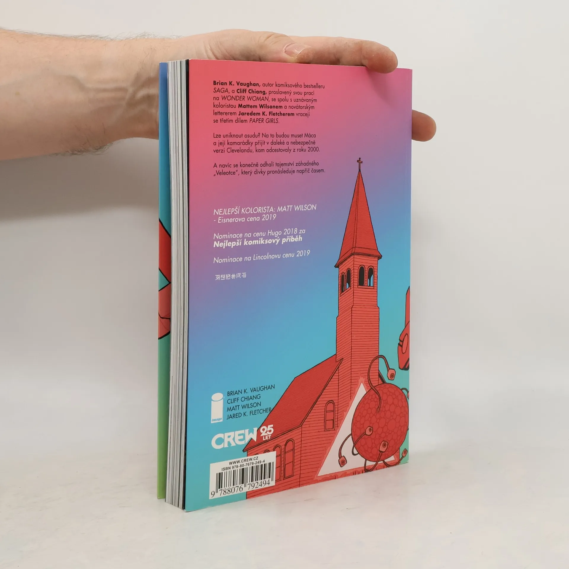 Brian K. Vaughan, autor komiksového bestselleru SAGA, a Cliff Chiang, proslavený svou prací na WONDER WOMAN, se spolu s uznávaným koloristou Mattem Wilsonem a novátorským lettererem Jaredem K. Fletcherem vrací s temně dramatickým třetím dílem PAPER GIRLS. Lze uniknout osudu? Na to budou muset Máca a její kamarádky přijít v daleké a nebezpečné verzi Clevelandu, kam odcestovaly z roku 2000. A navíc se konečně odhalí tajemství záhadného „Veleotce“, který dívky pronásleduje napříč časem.