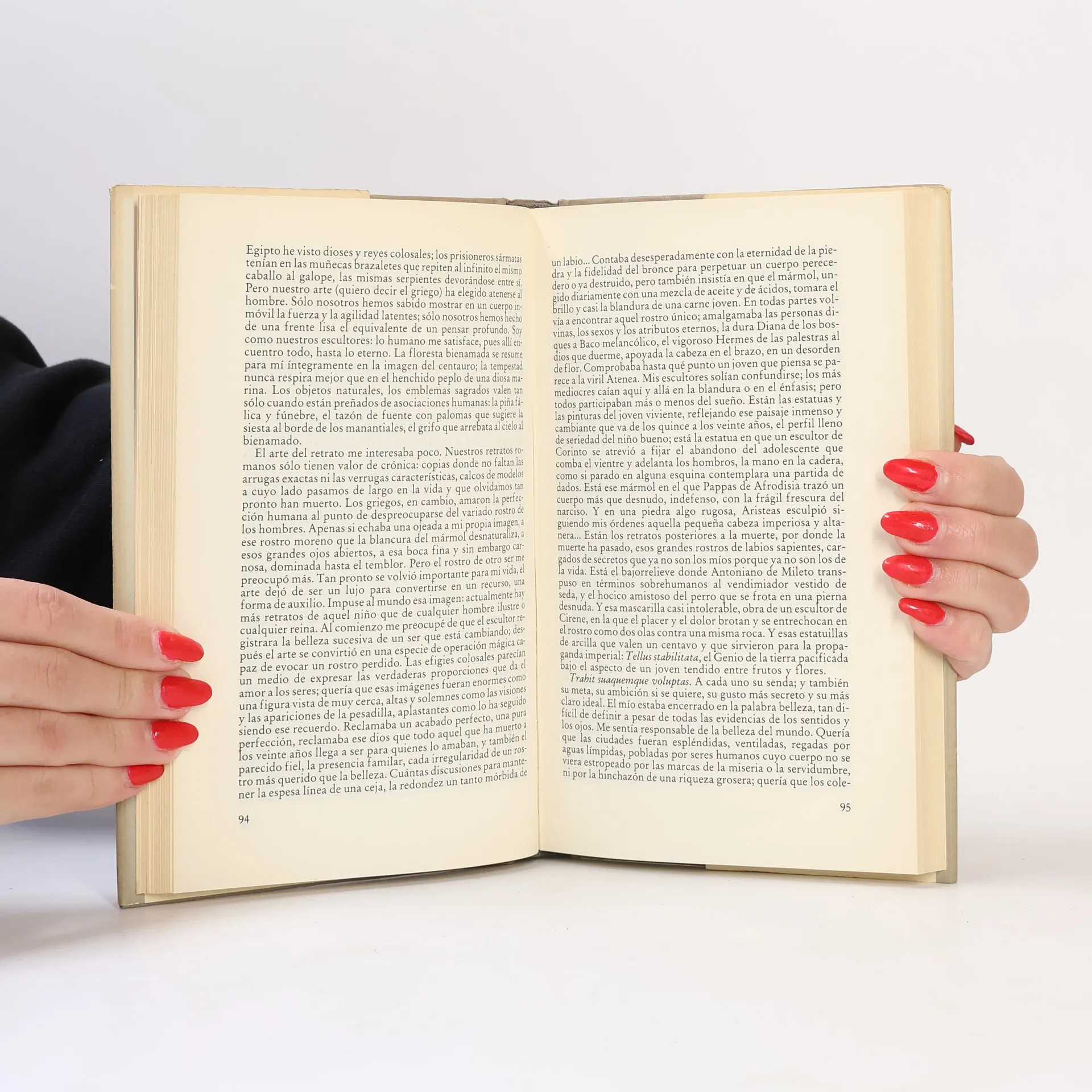 "La mayoría de los hombres gusta resumir su vida en una fórmula, a veces jactanciosa o quejumbrosa, casi siempre recriminatoria; el recuerdo les fabrica, complaciente, una existencia explicable y clara. Mi vida tiene contornos menos definidos. Como suele suceder, lo que no fui es quizá lo que más ajustadamente la define: buen soldado pero en modo alguno hombre de guerra; aficionado al arte, pero no ese artista que Nerón creyó ser al morir; capaz de cometer crímenes, pero no abrumado por ellos. Pienso a veces que los grandes hombres se caracterizan precisamente por su posición extrema; su heroísmo está en mantenerse en ella toda la vida. Son nuestros polos o nuestros antípodas".
