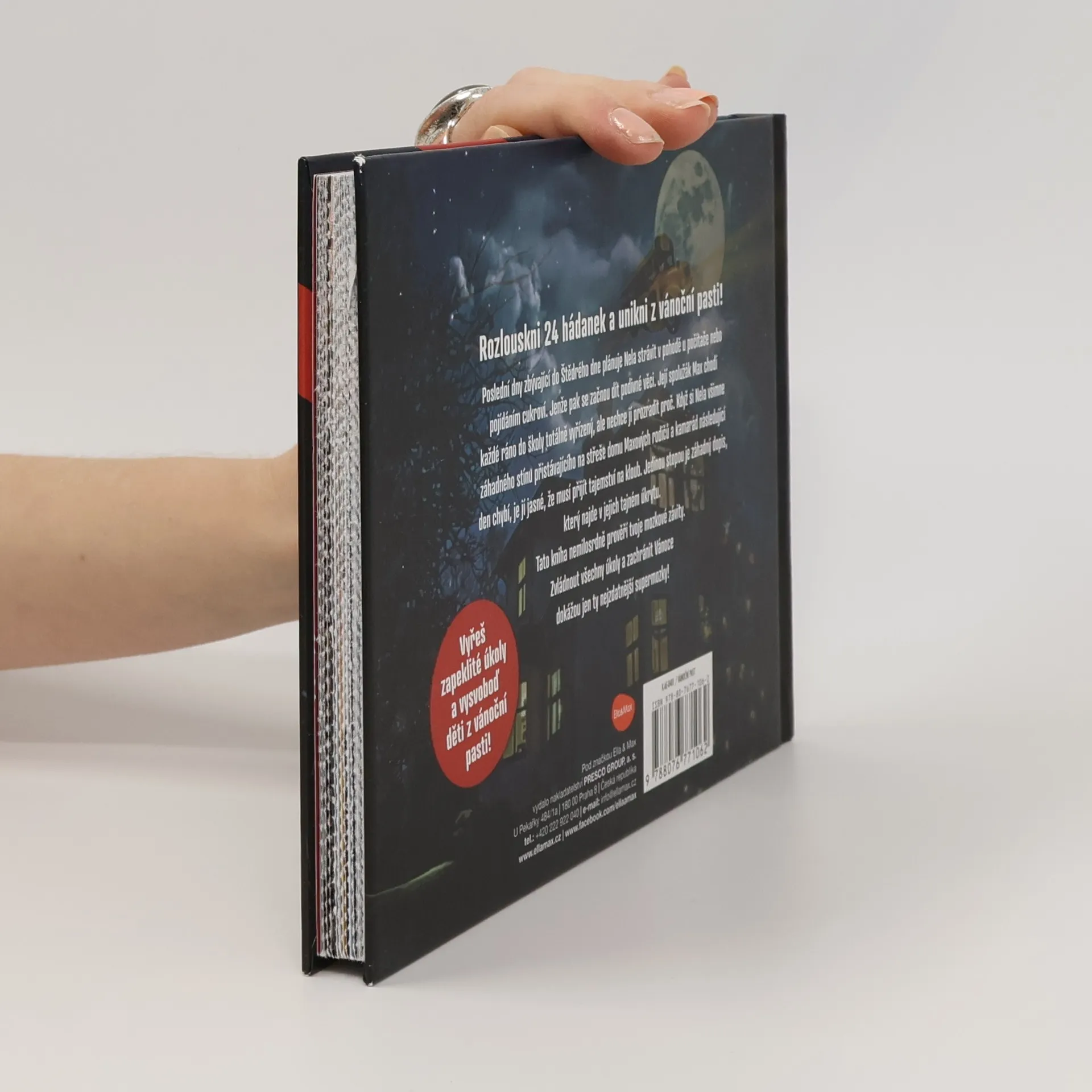 Poslední dny před Vánoci plánuje Nela strávit v pohodě u počítače nebo pojídáním cukroví. Jenže pak se začnou dít podivné věci. Její spolužák Max chodí do školy totálně vyřízený, ale nechce jí prozradit proč. Když si Nela všimne záhadného stínu přistávajícího na střeše Maxova domu a kamarád následující den chybí, je jí jasné, že to není jen tak. Máte dost odvahy a důvtipu? Jen když postupně vyluštíte všech 24 zapeklitých hádanek, dokážete osvobodit Maxe a další děti z vánoční pasti!