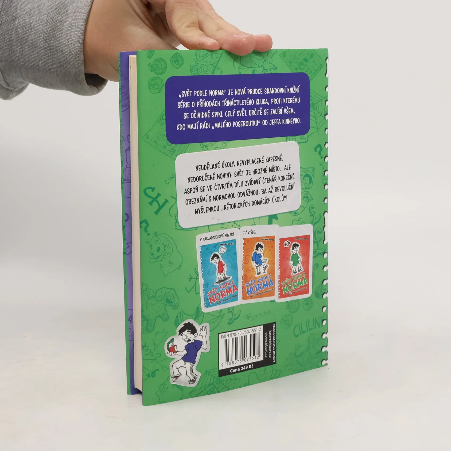 Seznamte se s Normem, patrně posledním klukem na planetě, který ještě nemá iPad. Což je do nebe volající nespravedlnost! Horší je snad už jen to, že aby ho Norm nakonec přece jen dostal, bude patrně muset PRACOVAT! Navíc se rozvážka novin a časopisů, která se milovníkovi ježdění na kole zdá být ještě poměrně snesitelným mučením, ukáže jako věc, kterou je dost lehké pustit z hlavy. Něco na způsob domácího úkolu z francouzštiny, který Norm, quelle fromage, vlastně quelle dommage, už zase zapomněl udělat. Vlastně nezapomněl, jenom neudělal. Neudělané úkoly, nevyplacené kapesné, nedoručené noviny: svět je hrozné místo... ale aspoň se ve čtvrtém dílu zvídavý čtenář konečně obeznámí s Normovou odvážnou, ba až revoluční myšlenkou „řečnických domácích úkolů“! SVĚT PODLE NORMA je prudce srandovní knižní série o příhodách třináctiletého kluka, proti kterému se očividně spikl celý svět. Určitě se zalíbí všem, kdo mají rádi „malého poseroutku“ od Jeffa Kinneyho. Kniha je určena pro děti a mládež od jedenácti let, které jistě bude bavit i prohlížení černobílých obrázků, které perfektně ztvárňují řadu humorných situací. U mnohých jsou dopsány různé výkřiky a citoslovce.