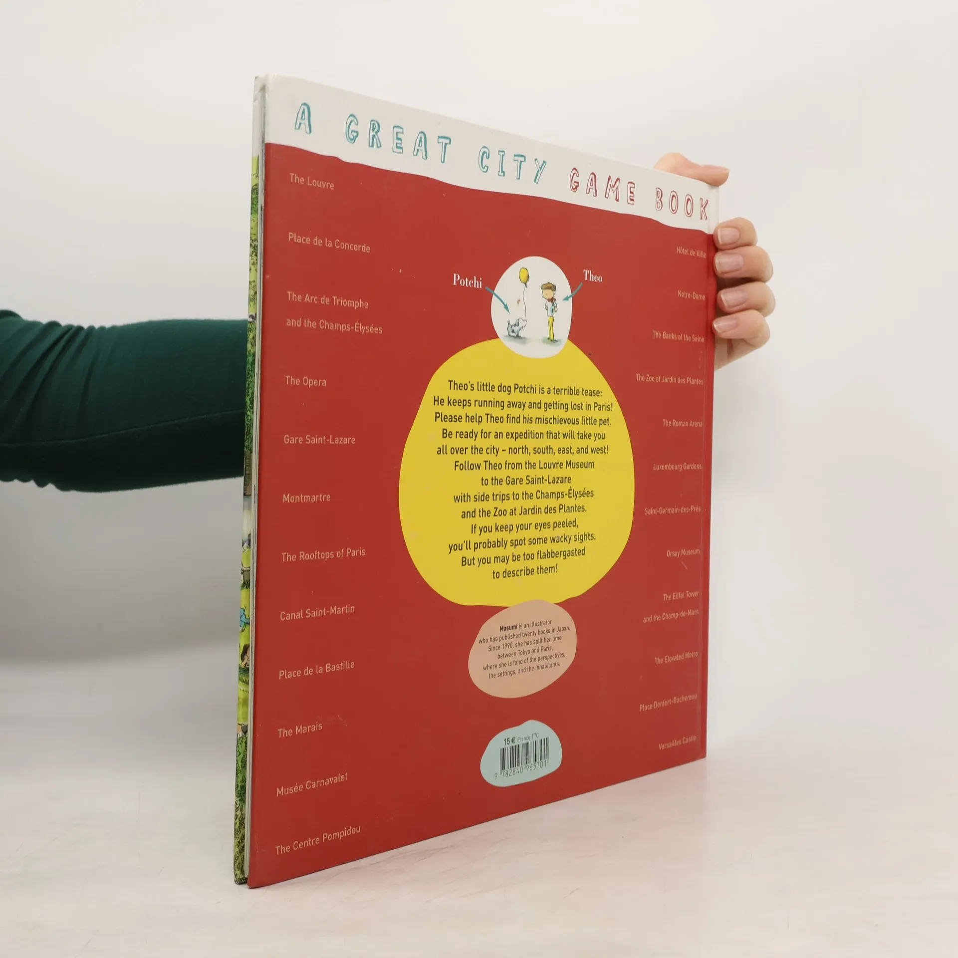 For readers with sharp eyes! Theo’s little dog Potchi is a terrible tease: He keeps running away and getting lost in Paris! Please help Theo find his mischievous little pet. Be ready for an expedition that will take you all over the city – north, south, east, and west! Follow Theo from the Louvre Museum to the Gare Saint-Lazare with side trips to the Champs-Élysées and the Zoo at Jardin des Plantes. If you keep your eyes peeled, you’ll probably spot some wacky sights. But you may be too flabbergasted to describe them! Masumi is an illustrator who has published twenty books in Japan. Since 1990, she has split her time between Tokyo and Paris where she is fond of the perspectives, the settings, and the inhabitants.