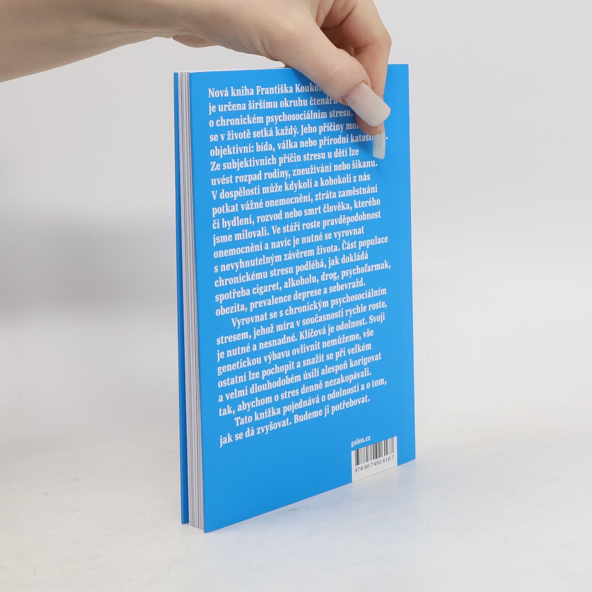 Nová kniha Františka Koukolíka Odolnost je určena širšímu okruhu čtenářů a pojednává o chronickém psychosociálním stresu, s nímž se v životě setká každý. Jeho příčiny mohou být objektivní: bída, válka nebo přírodní katastrofa. Ze subjektivních příčin stresu u dětí lze uvést rozpad rodiny, zneužívání nebo šikanu. V dospělosti může kdykoli a kohokoli z nás potkat vážné onemocnění, ztráta zaměstnání či bydlení, rozvod nebo smrt člověka, kterého jsme milovali. Ve stáří roste pravděpodobnost onemocnění a navíc je nutné se vyrovnat s nevyhnutelným závěrem života. Část populace chronickému stresu podléhá, jak dokládá spotřeba cigaret, alkoholu, drog, psychofarmak, obezita, prevalence deprese a sebevražd. Vyrovnat se s chronickým psychosociálním stresem, jehož míra v současnosti rychle roste, je nutné a nesnadné. Klíčová je odolnost. Svoji genetickou výbavu ovlivnit nemůžeme, vše ostatní lze pochopit a snažit se při velkém a velmi dlouhodobém úsilí alespoň korigovat tak, abychom o stres denně nezakopávali. Tato knížka pojednává o odolnosti a o tom, jak se dá zvyšovat. Budeme ji potřebovat.