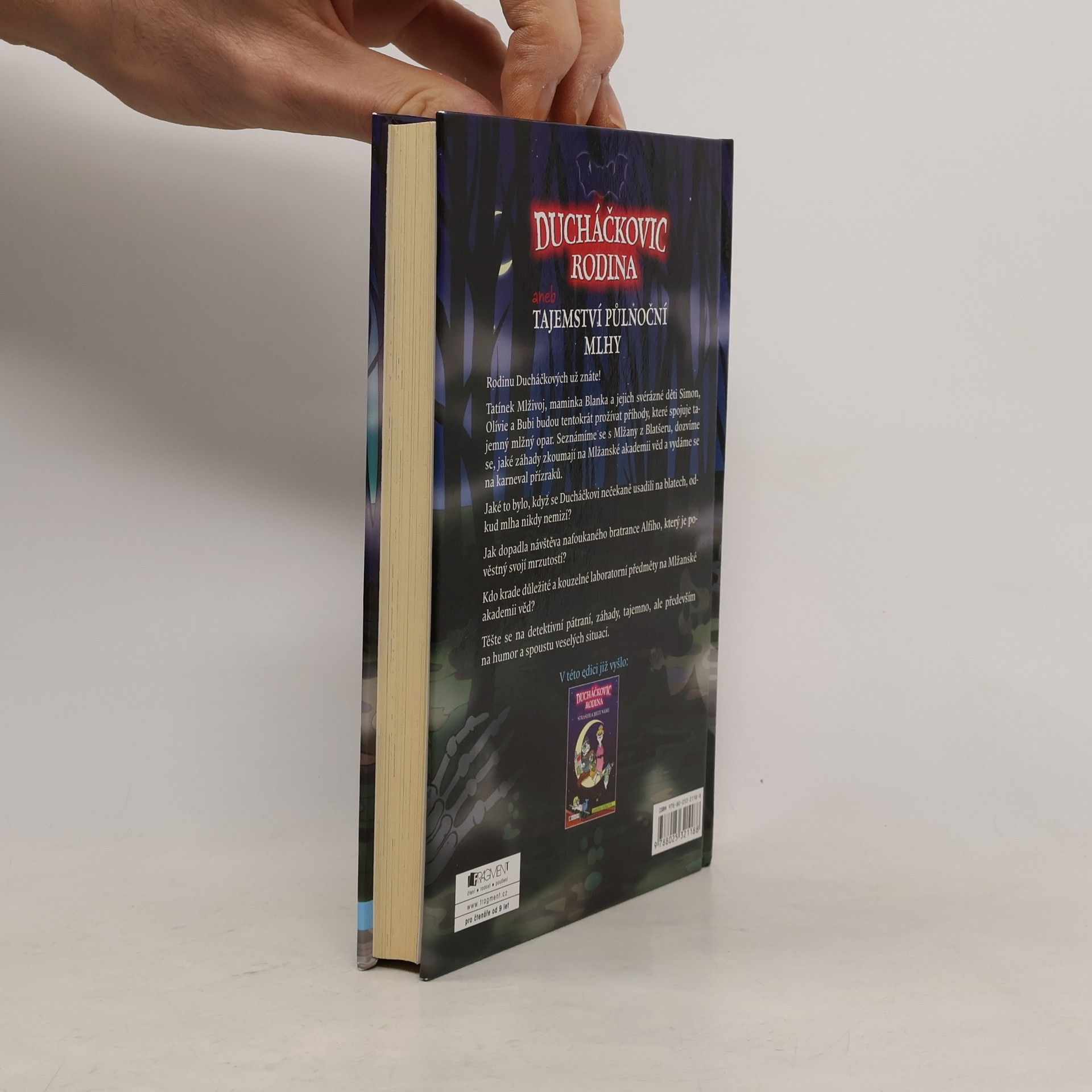 Mlha pomalu řídne... a ano, už je vidíme! Rodina Ducháčkových a s nimi nové příběhy plné napětí, dobrodružství a humoru. Rodinu Ducháčkových už znáte! Tatínek Mlživoj, maminka Blanka a jejich svérázné děti Simon, Olivie a Bubi budou tentokrát prožívat příhody, které spojuje tajemný mlžný opar. Seznámíme se s Mlžany z Blatšeru, dozvíme se, jaké záhady zkoumají na Mlžanské akademii věd a vydáme se na mlžanský karneval přízraků. Jaké to bylo, když se Ducháčkovi se svým stěhovavým domem usadili na blatech? Jak dopadla návštěva nafoukaného bratrance Alfieho, který je pověstný svojí mrzutostí? Kdo krade důležité přísady do lektvarů a kouzelné laboratorní předměty na Mlžanské akademii?