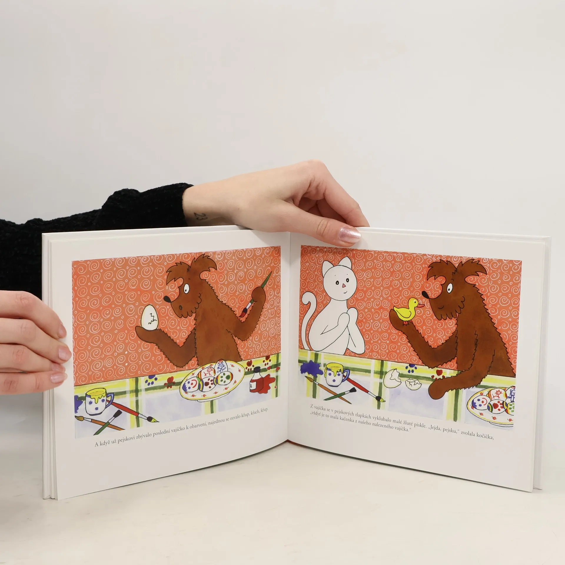 Milé děti, v této knížce se dočtete o tom, jak jsme se spolu připravovali na Velikonoce a jak se nám ulevilo, když se z našeho nalezeného vajíčka nevylíhnul hladový drak a ani pyšný páv. Tak nazdar a v úctě Vaše KOČIČKA a PEJSEK